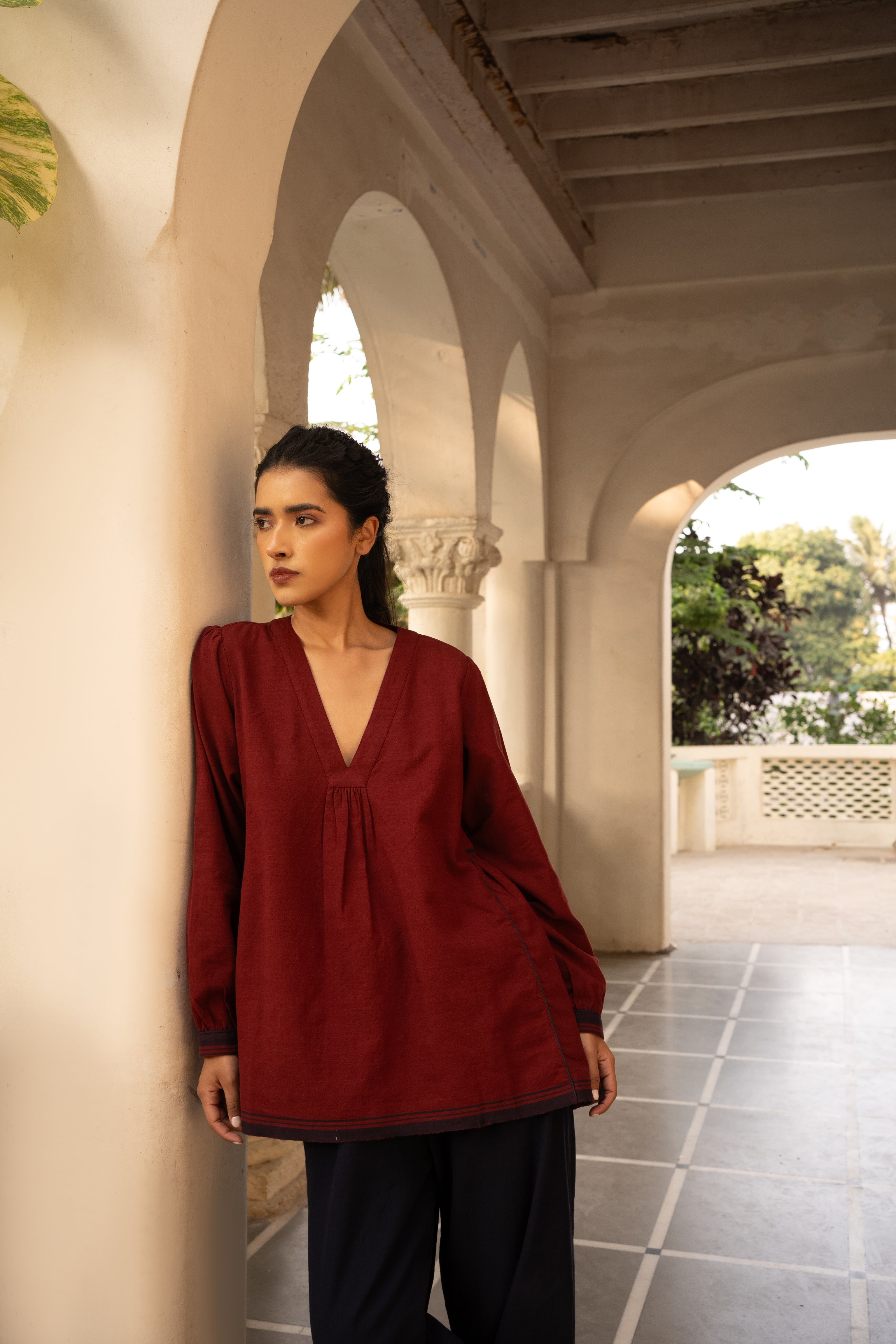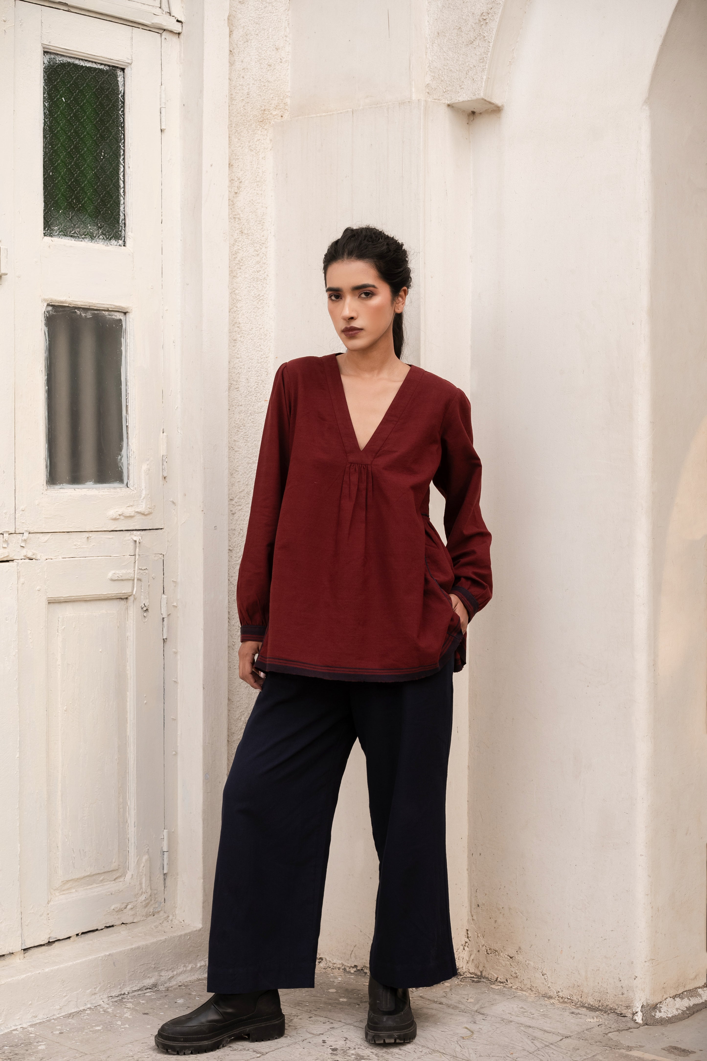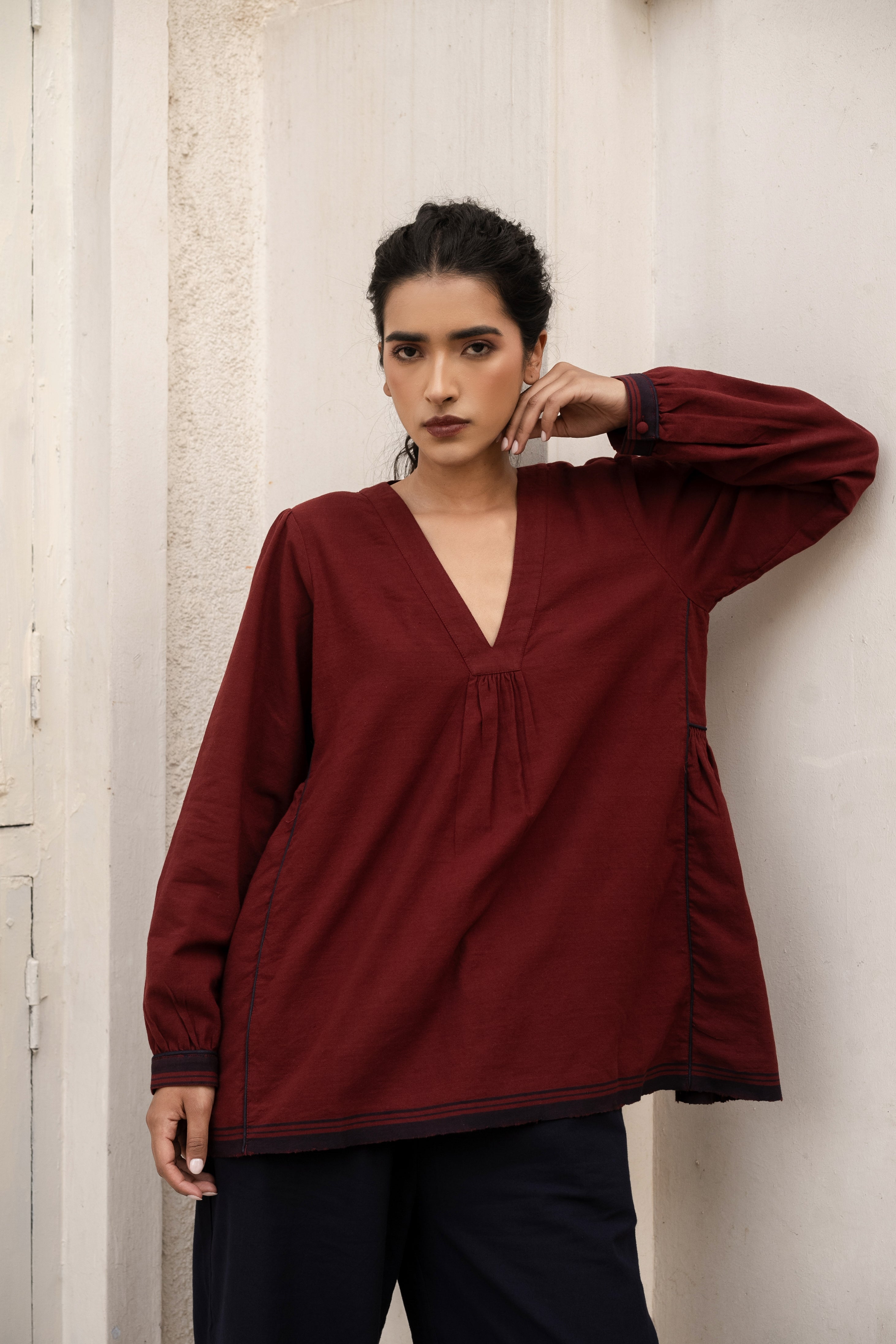 Relaxed fitting, fully lined top with flattering V neck and front gathers. Underarm side gathers for shaping.  Intricate contrast running stitch detail by hand and self fabric piping. Fully lined and box pleat detail on back.