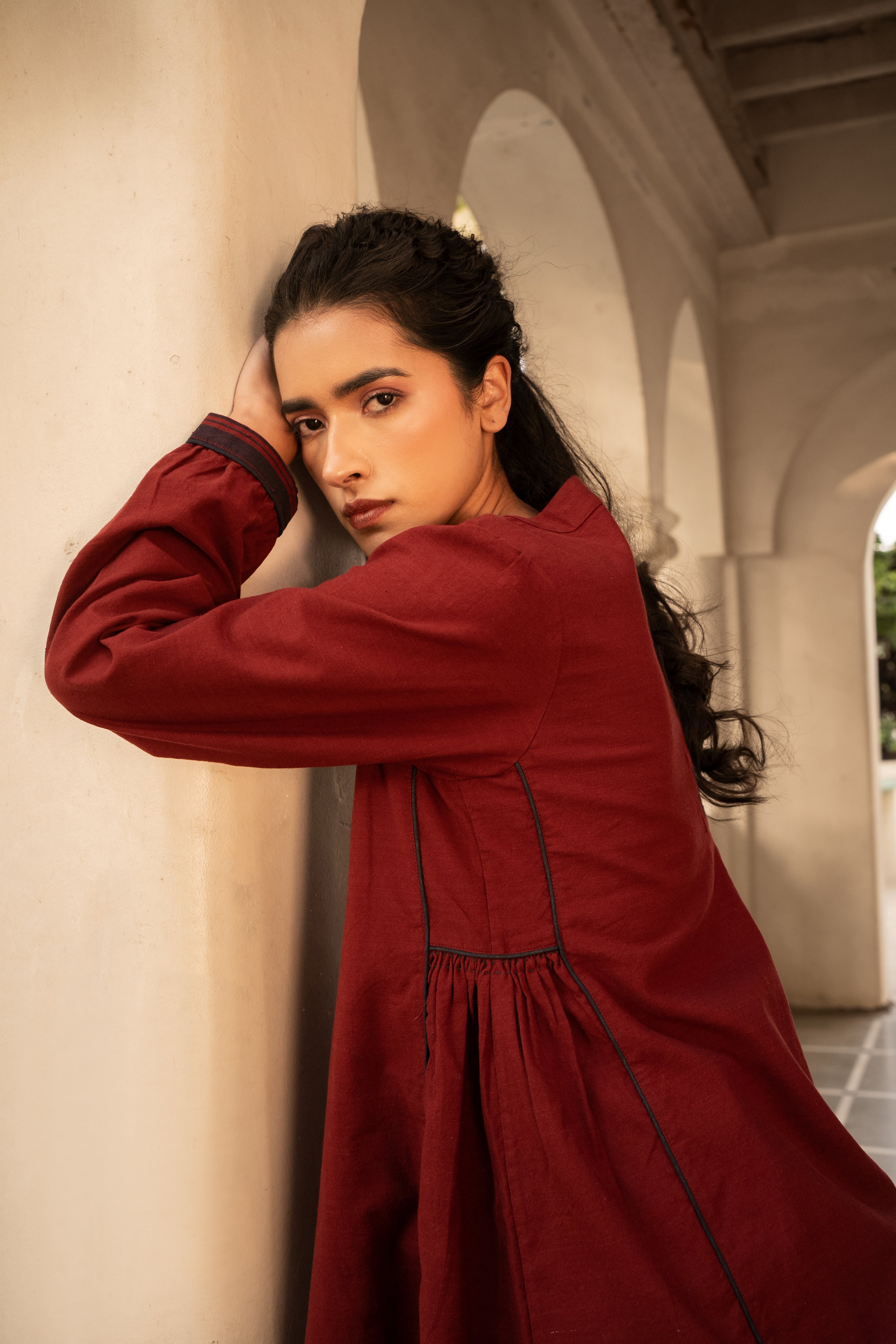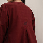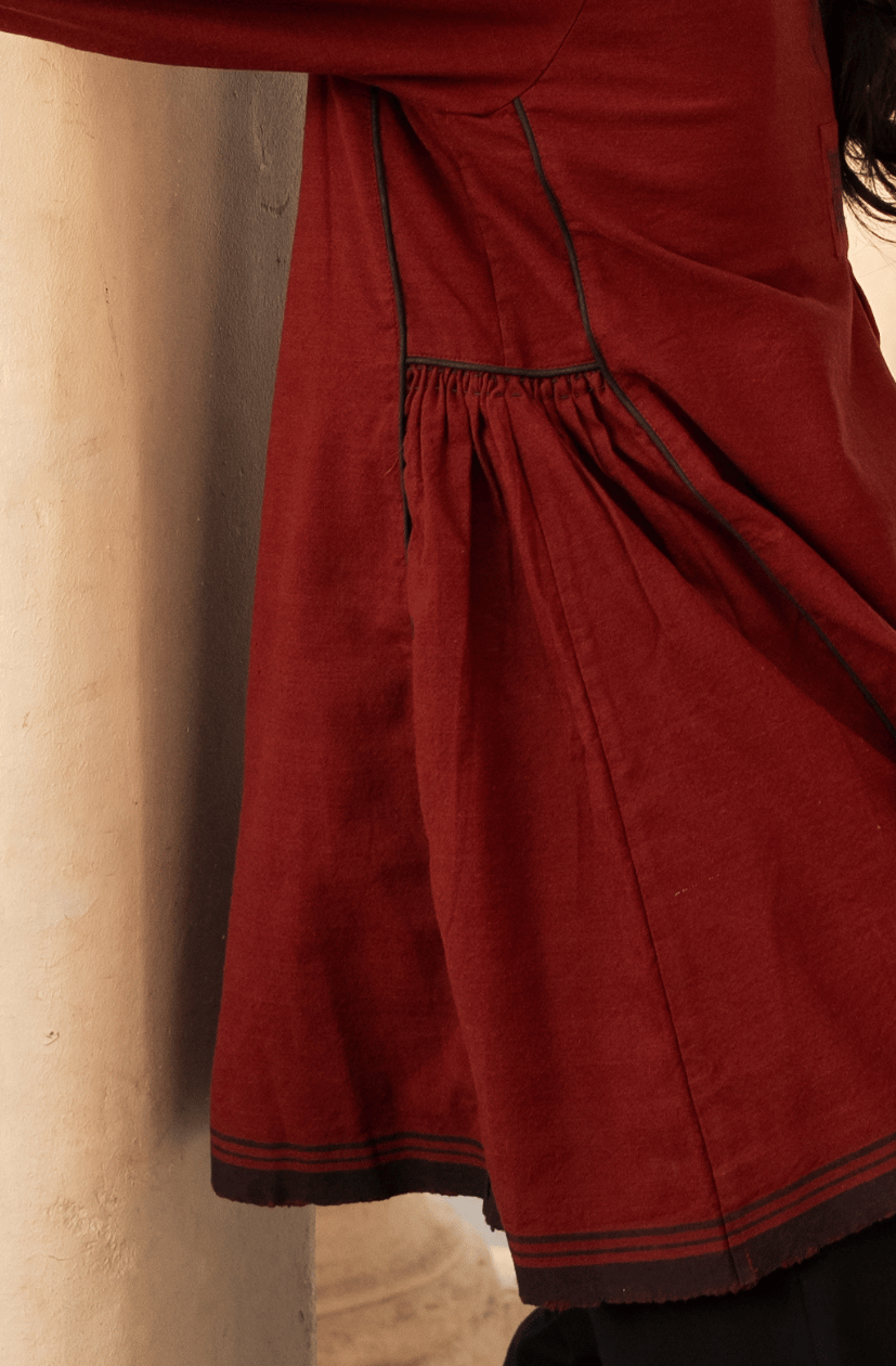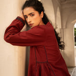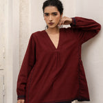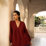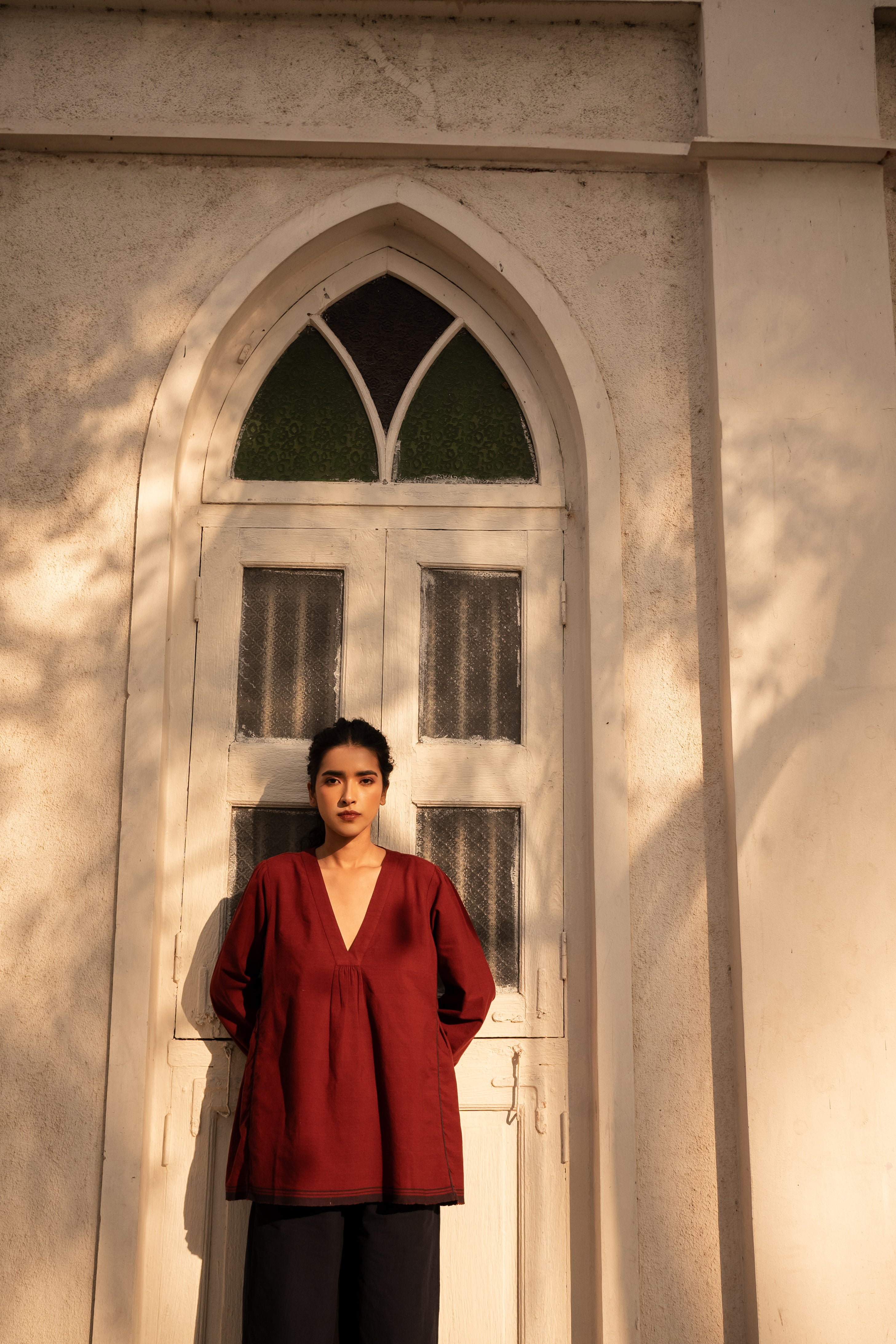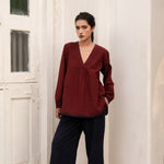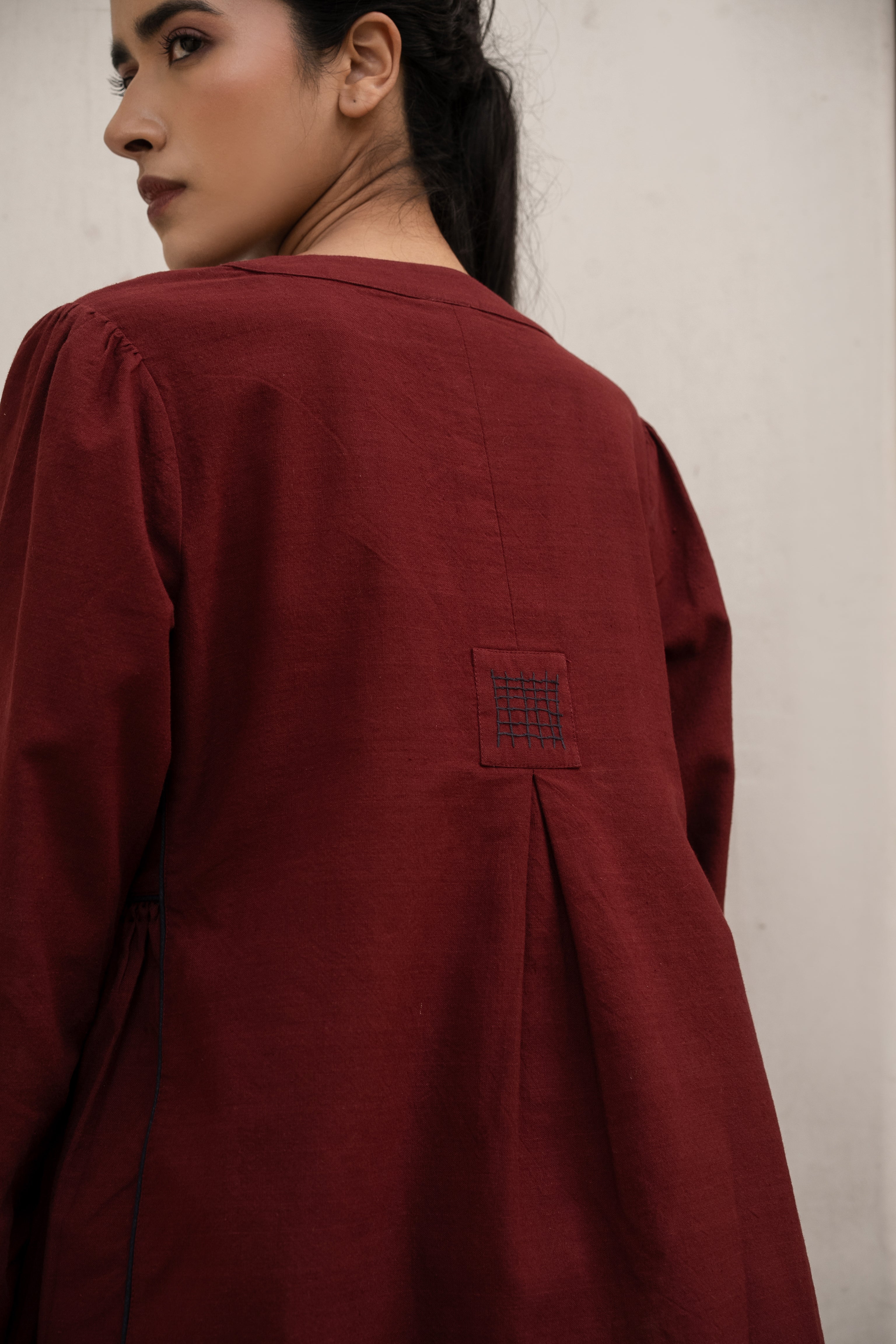 Relaxed fitting, fully lined top with flattering V neck and front gathers. Underarm side gathers for shaping.  Intricate contrast running stitch detail by hand and self fabric piping. Fully lined and box pleat detail on back.
