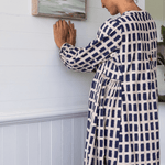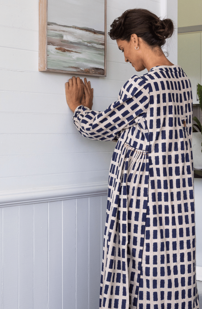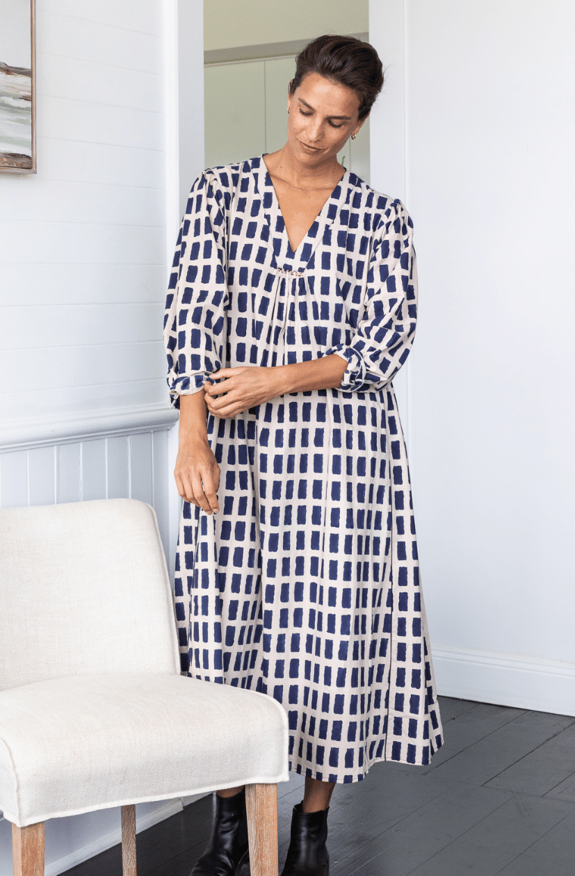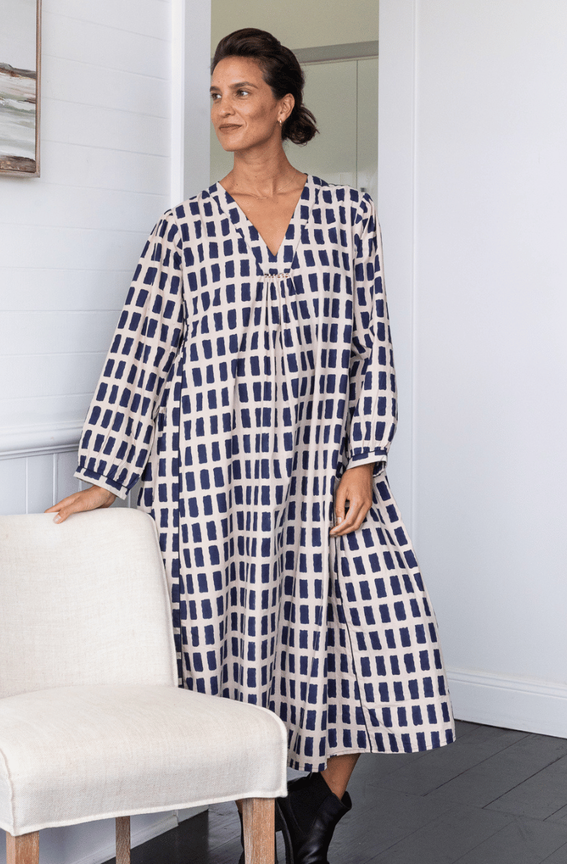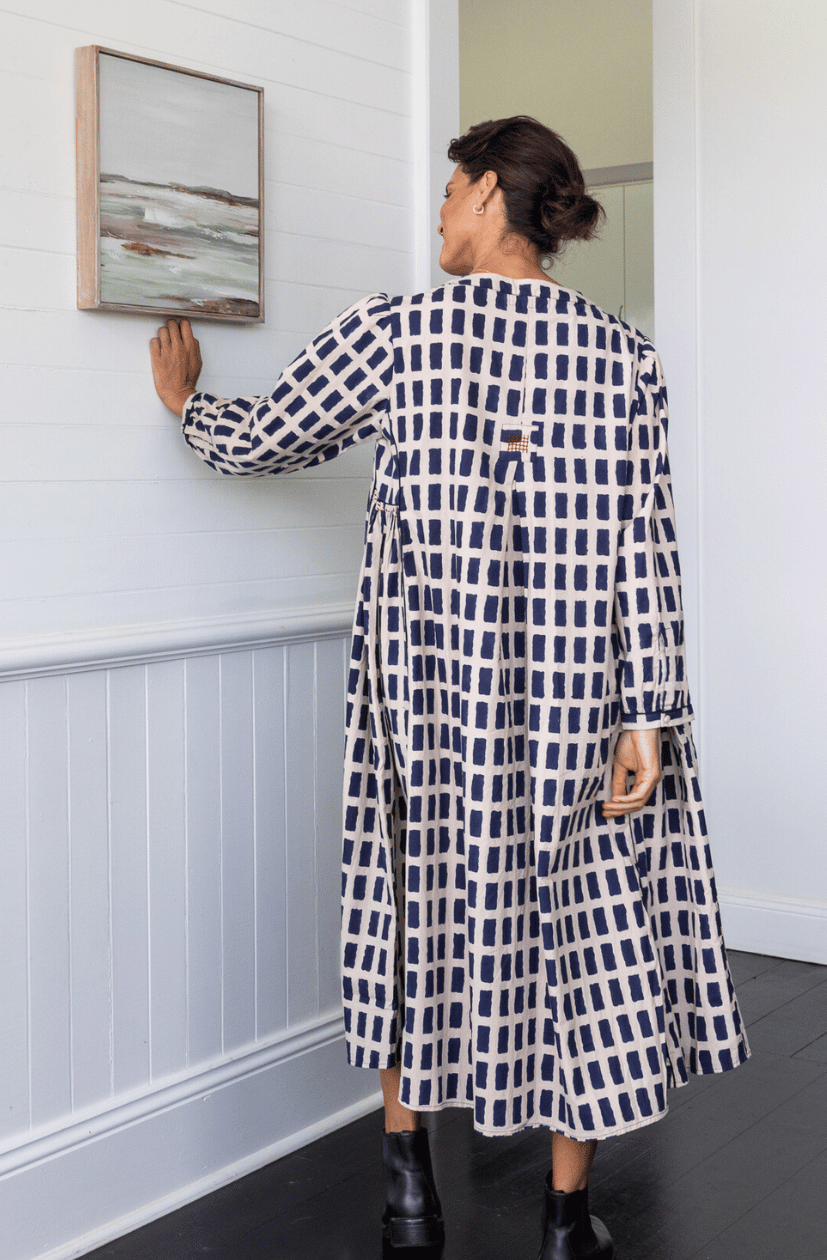 Relaxed fitting dress with flattering V neck and front gathers. Underarm side gathers and contrast piping detail for shaping.  Running stitch detail by hand on front and side gathers. Box pleat on back with hand stitch intricate detail. Fully lined & inseam pockets
