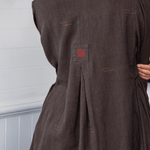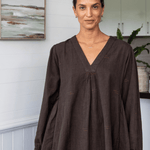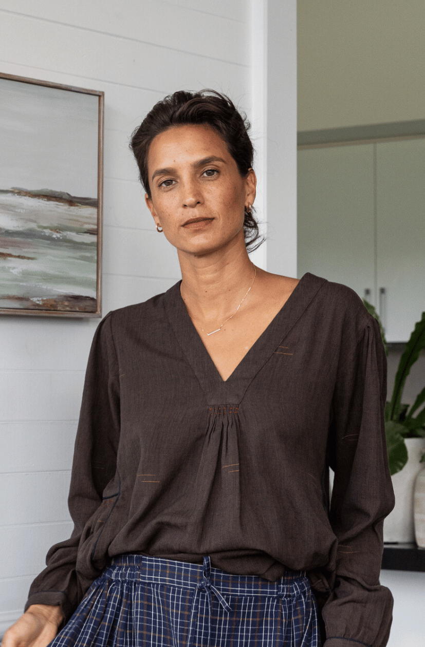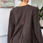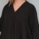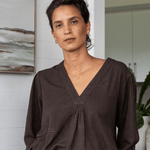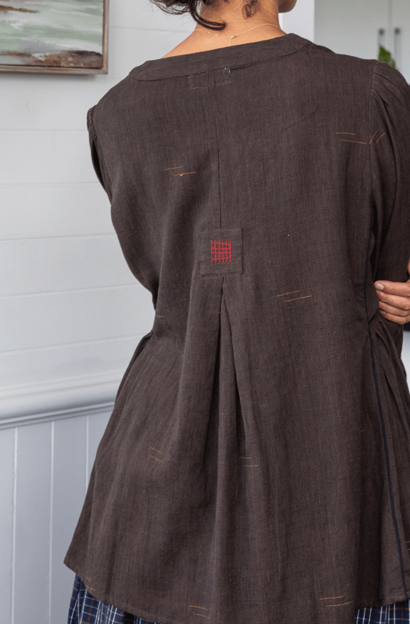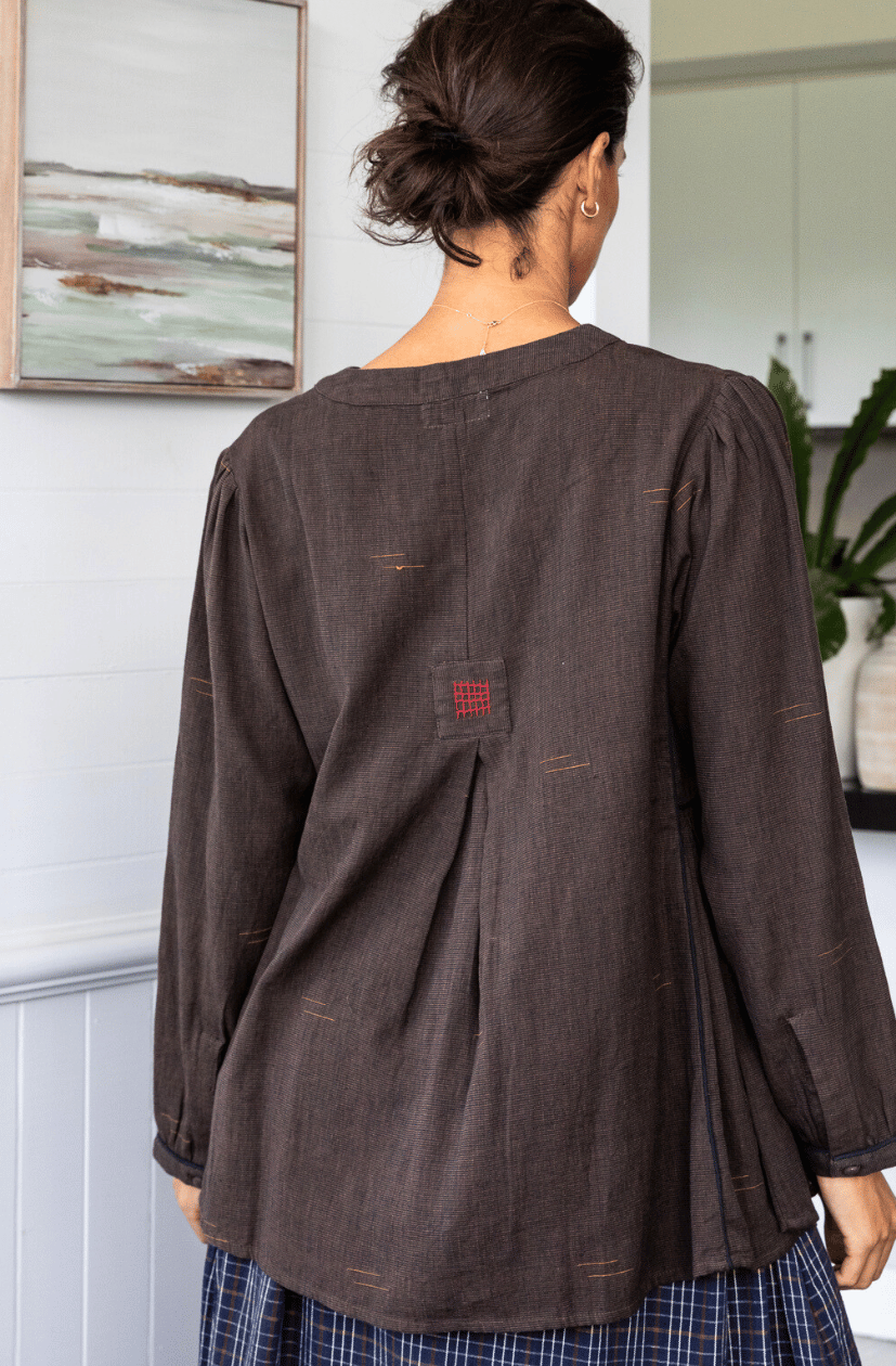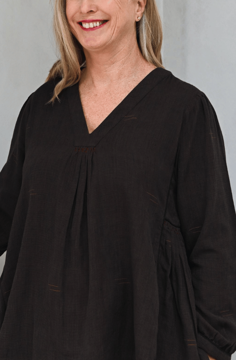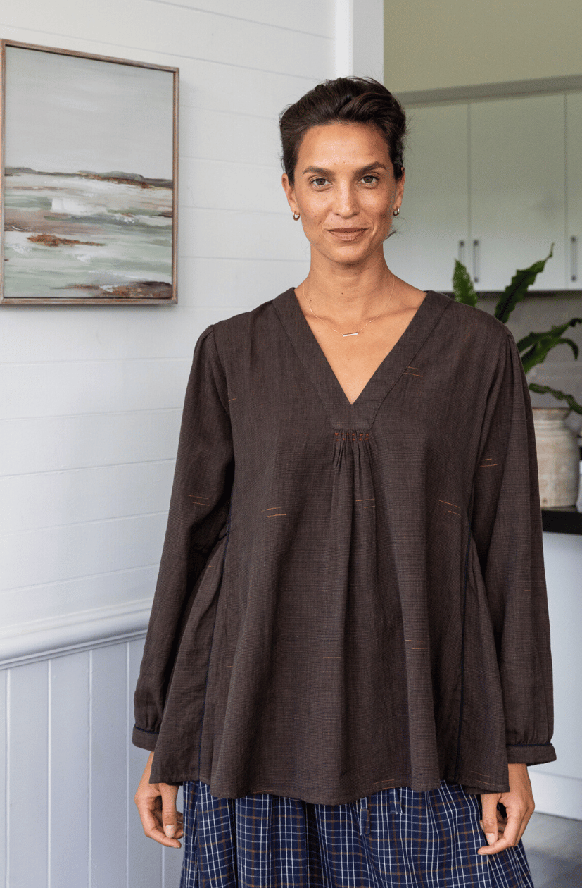 Relaxed fitting top with flattering V neck and front gathers. Underarm side gathers and contrast piping detail for shaping. Running stitch detail by hand, on front and side gathers. Box pleat on back with intricate hand stitch detail.