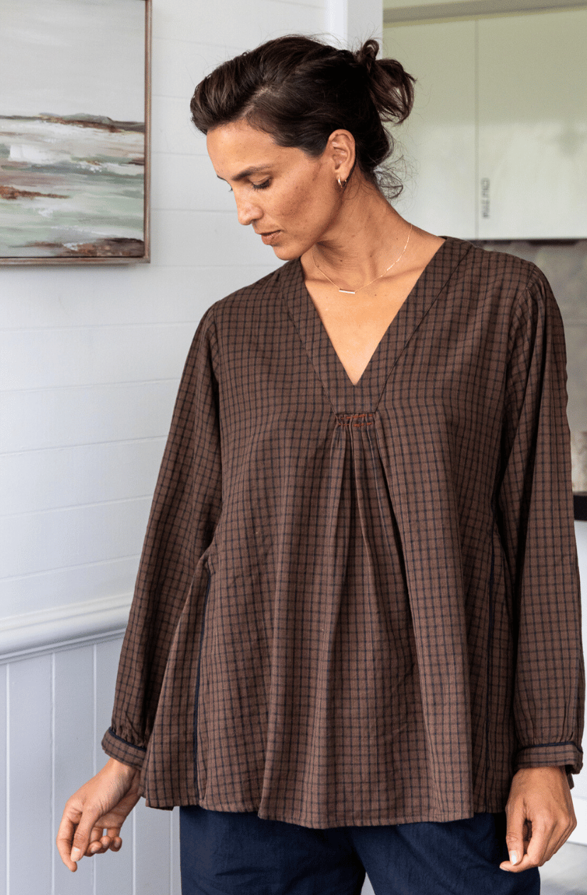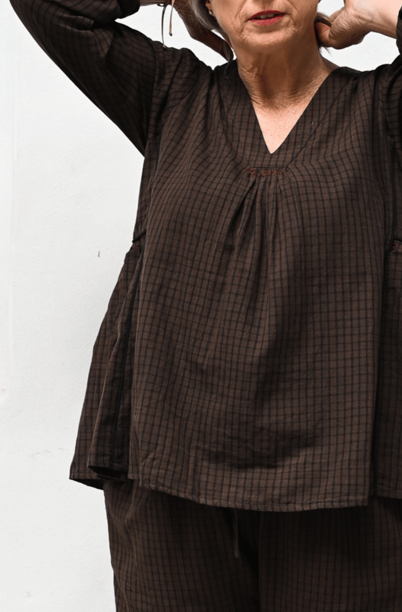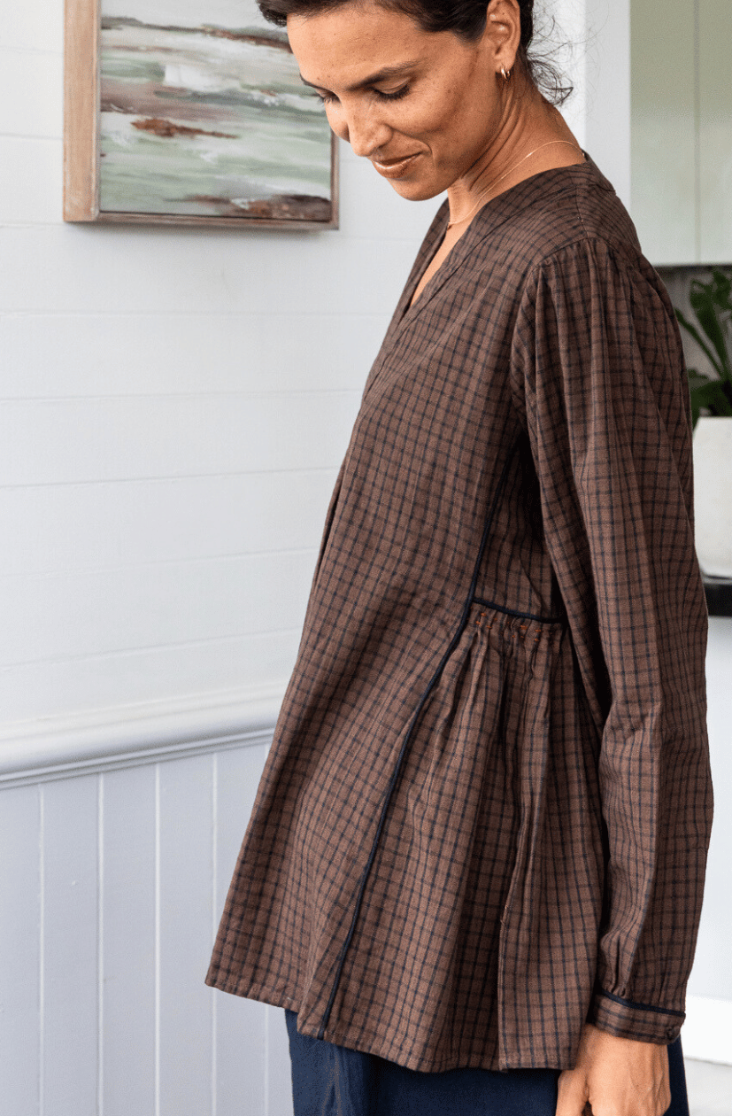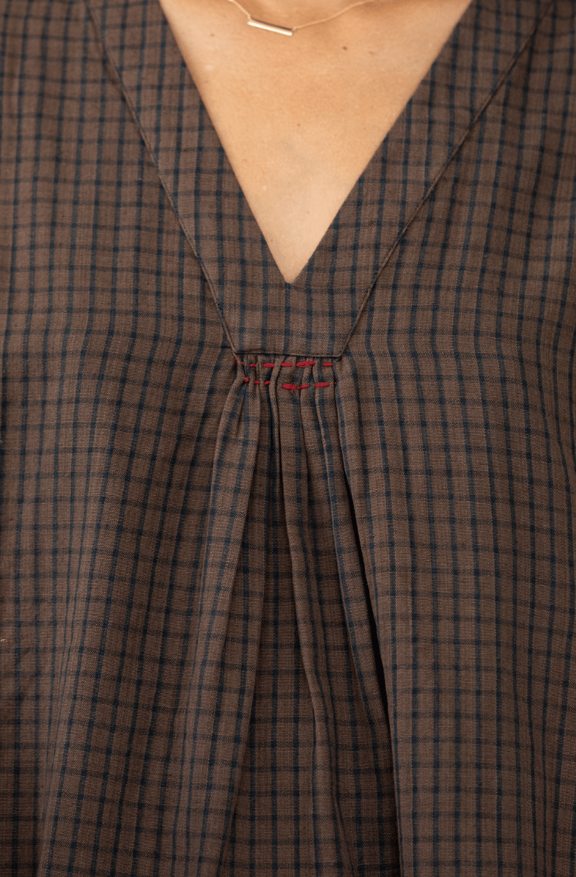 Relaxed fitting top with flattering V neck and front gathers. Underarm side gathers and contrast piping detail for shaping. Running stitch detail by hand, on front and side gathers. Box pleat on back with intricate hand stitch detail.