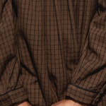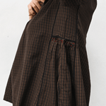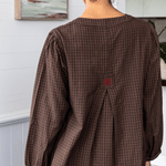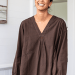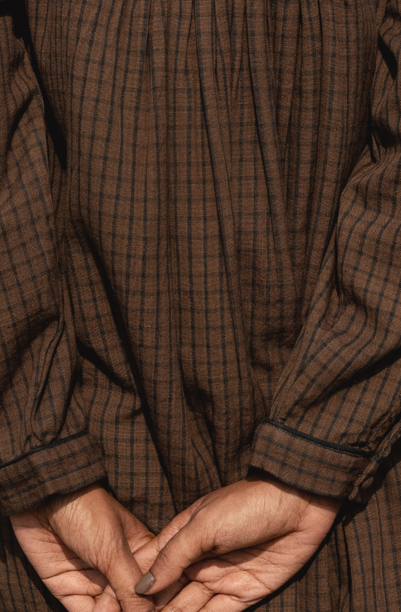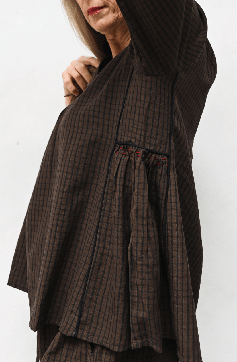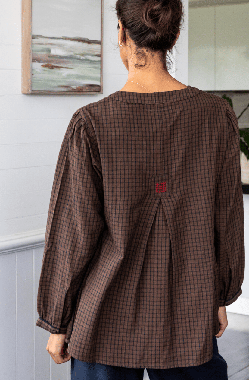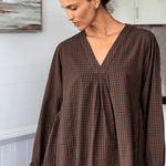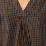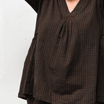 Relaxed fitting top with flattering V neck and front gathers. Underarm side gathers and contrast piping detail for shaping. Running stitch detail by hand, on front and side gathers. Box pleat on back with intricate hand stitch detail.