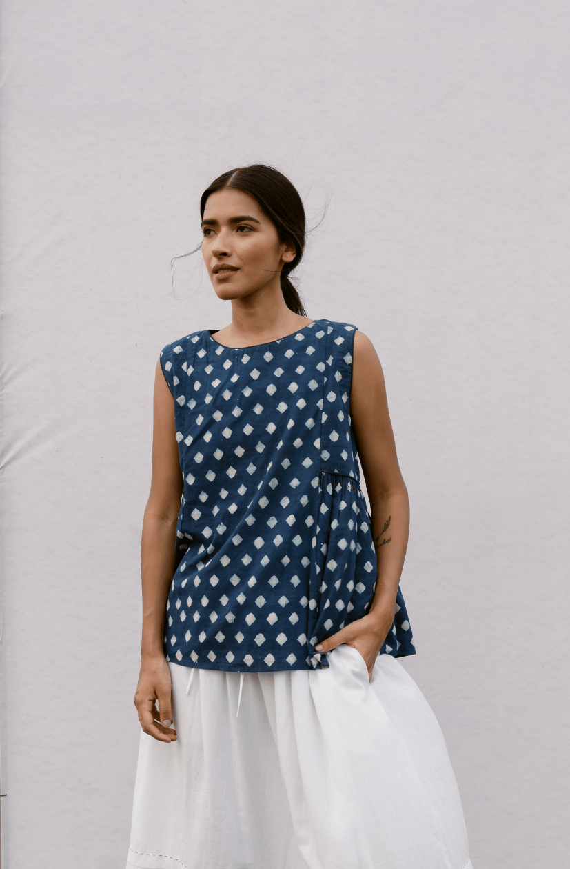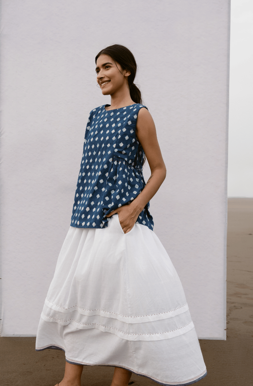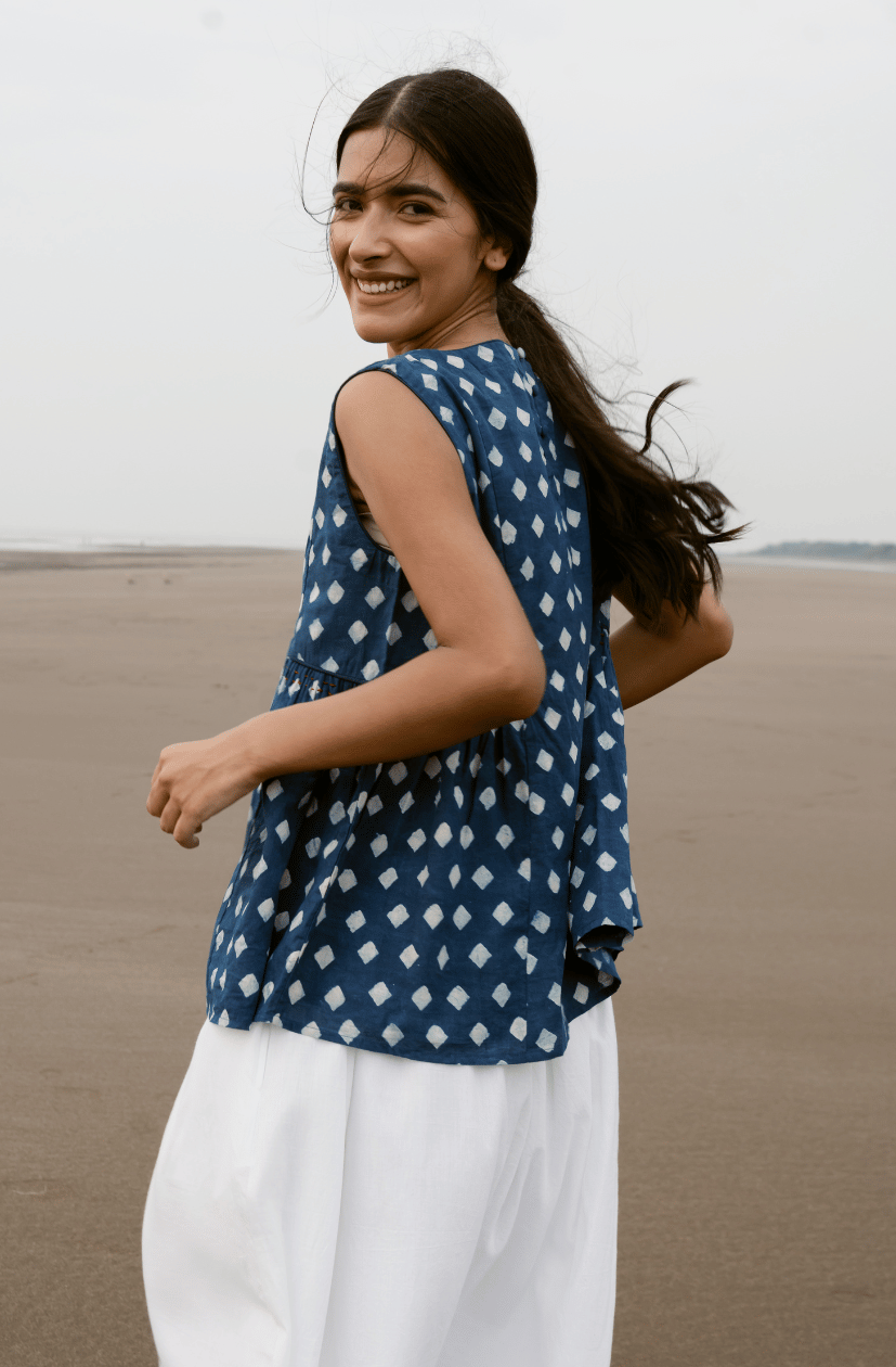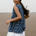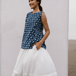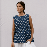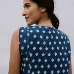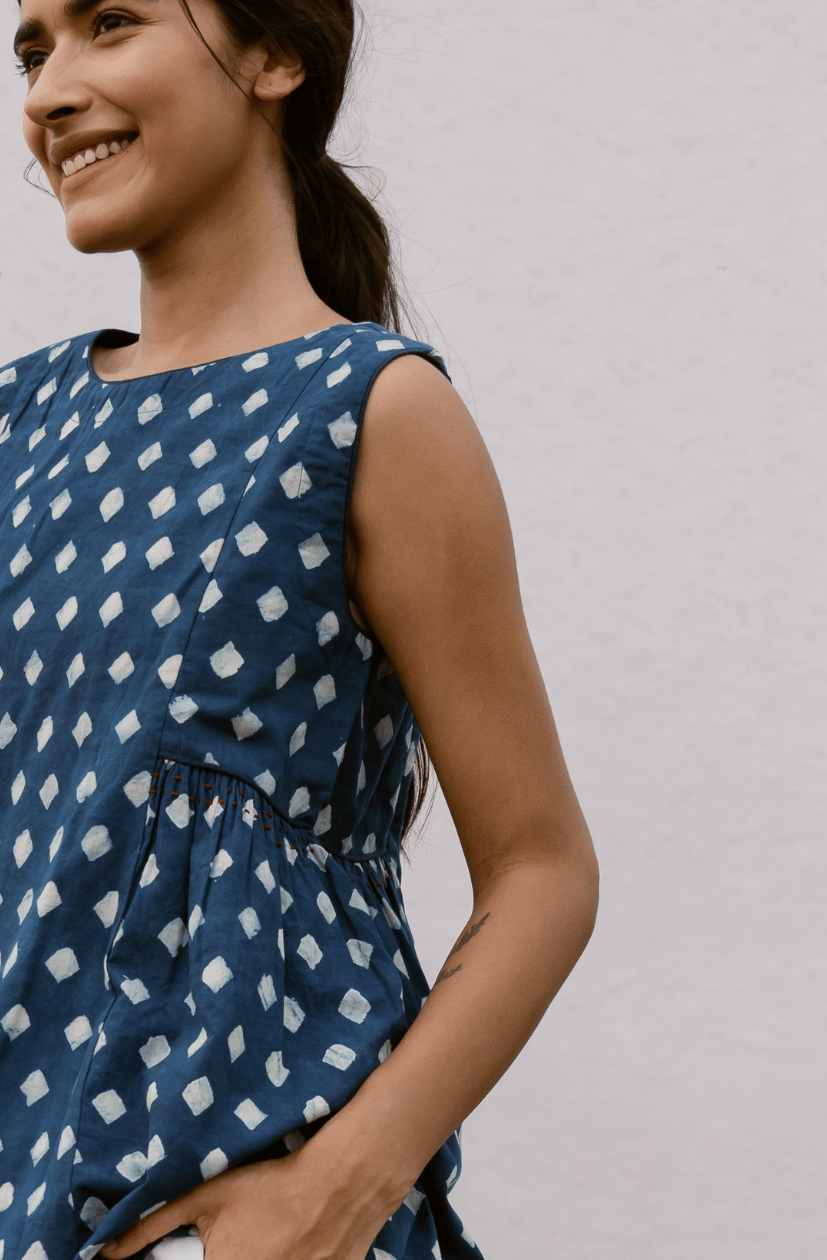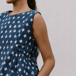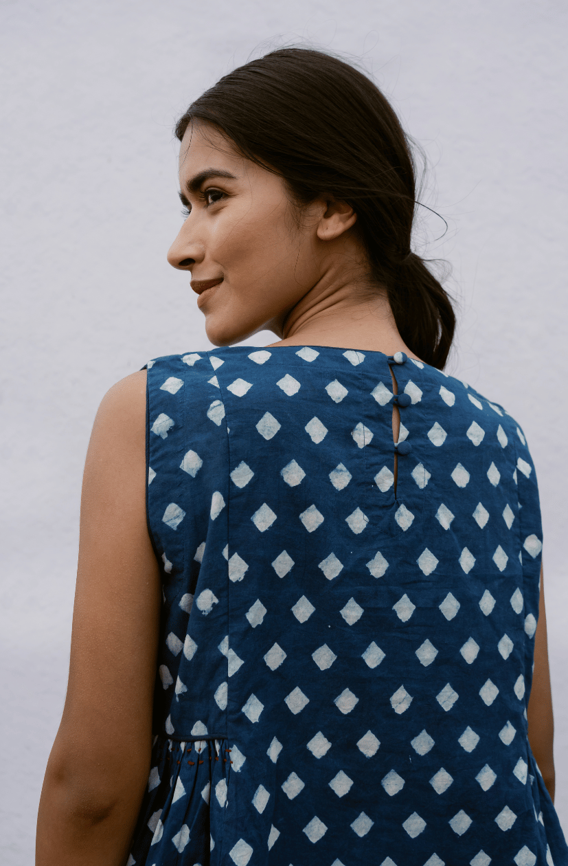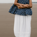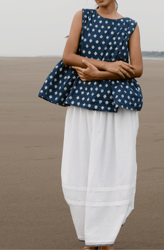 Slowmade process of resist dyeing has created our most beautiful "Indigo Sky" print in cotton. It is a hand dyed print dyed with indigo and needs to be treated with care.