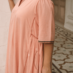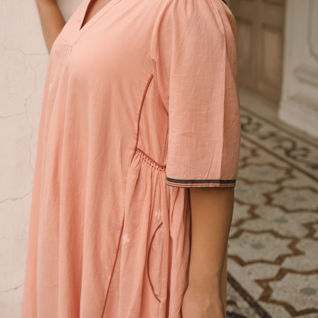 Relaxed fitting mid length dress with flattering V neck and soft front gathers
