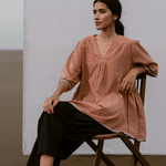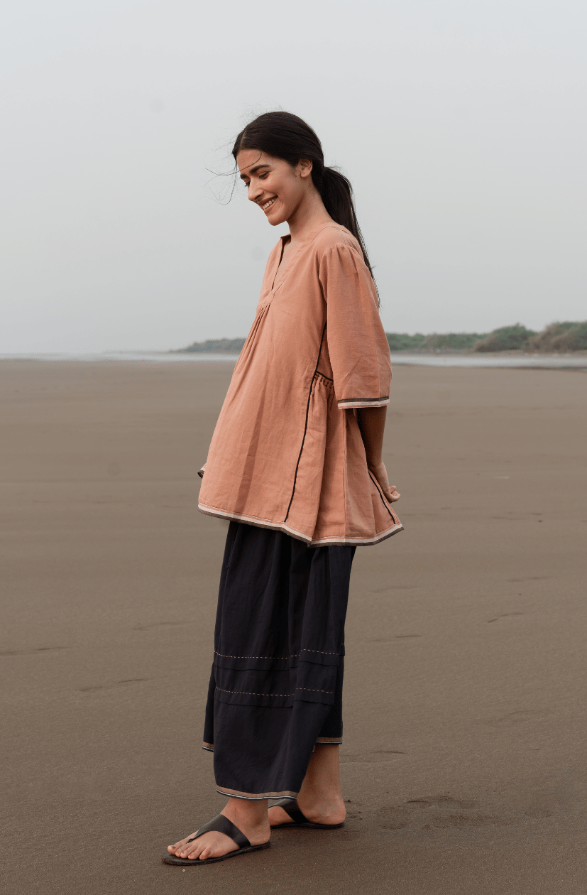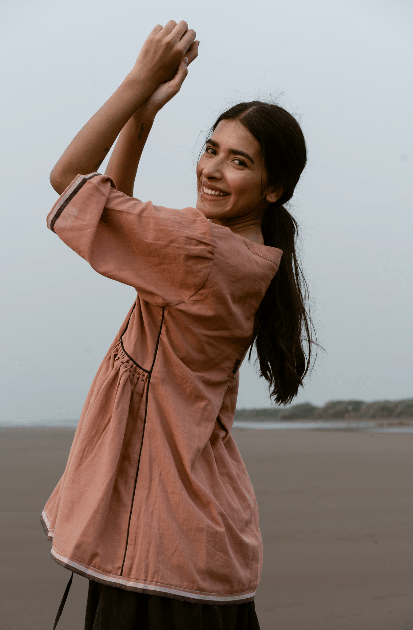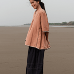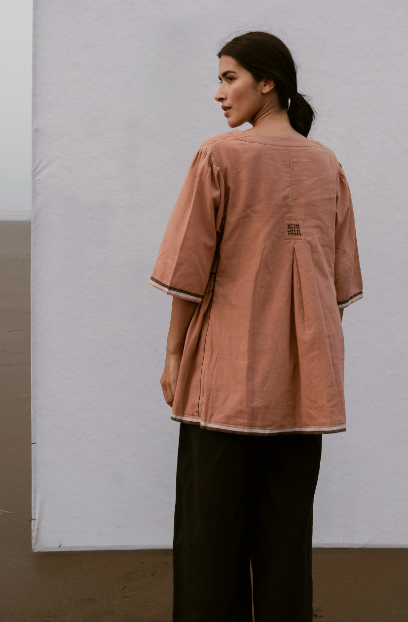 Underarm side gathers for shaping & contrast piping details. Running stitch detail by hand on side gathers. Box pleat on back with intricate hand stitch detail. Top fully lined & relaxed mid length sleeves. Contrast selvage detailing on hem and sleeves.