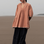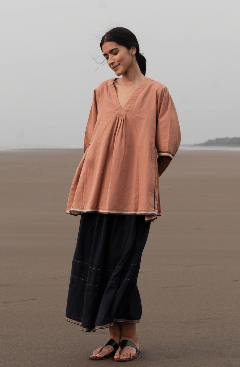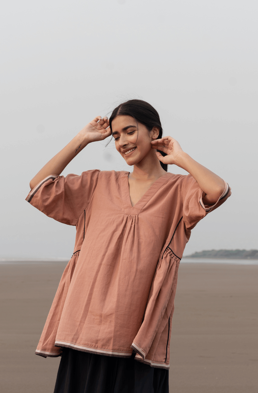 Relaxed fitting mid length top with flattering V neck and soft front gathers.