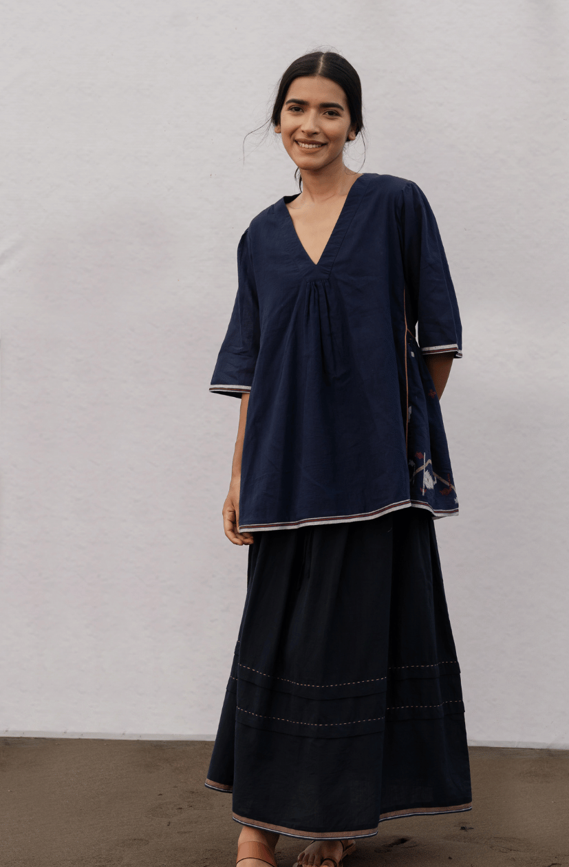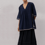 Underarm side gathers for shaping & contrast piping details. Running stitch detail by hand on side gathers. Box pleat on back with intricate hand stitch detail. Top fully lined & relaxed mid length sleeves. Contrast selvage detailing on hem and sleeves.