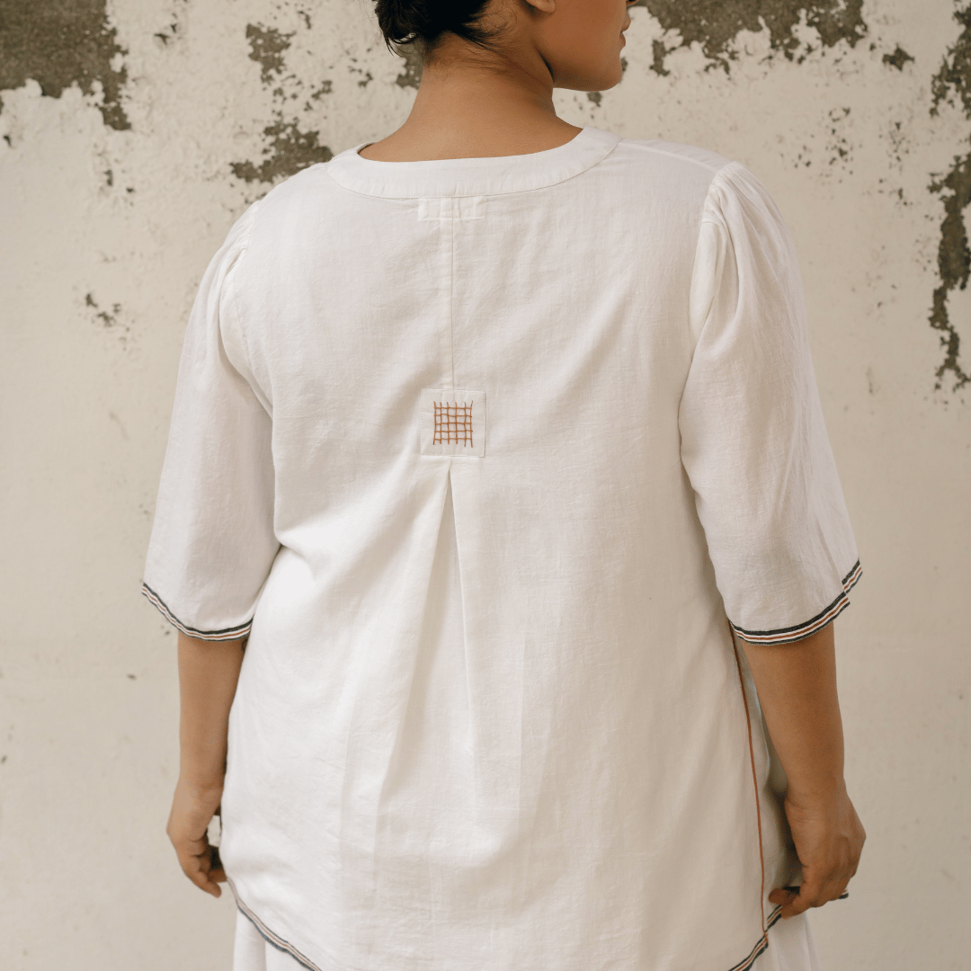 Underarm side gathers for shaping & contrast piping details. Running stitch detail by hand on side gathers. Box pleat on back with intricate hand stitch detail. Top fully lined & relaxed mid length sleeves. Contrast selvage detailing on hem and sleeves.