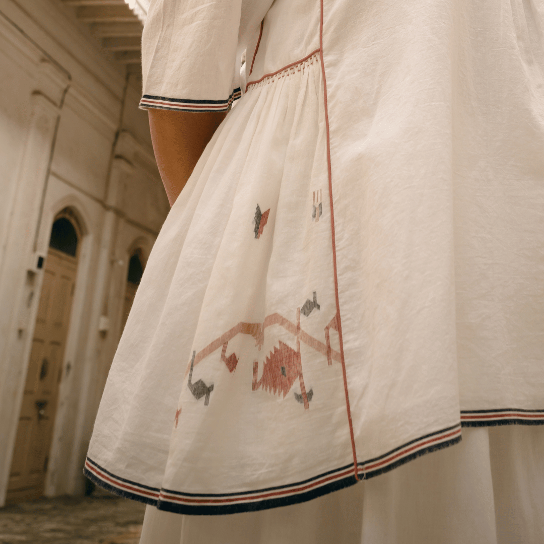 An extra weft weaving technique to create special motif designs into the base fabric. Evocative of exquisite craftsmanship, every design is carefully planned and woven into sheer soft cotton threads. An intricate Jamdhani weaving technique going back thousands of years.