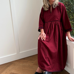 Relaxed high waisted dress with fine gathers on skirt for fullness. Round flat collar with front single button opening. Inseam pockets, contrast piping and hand stitch details right through