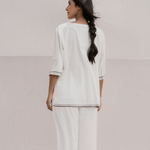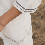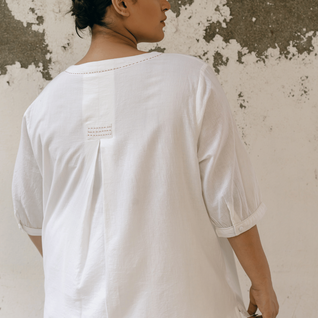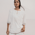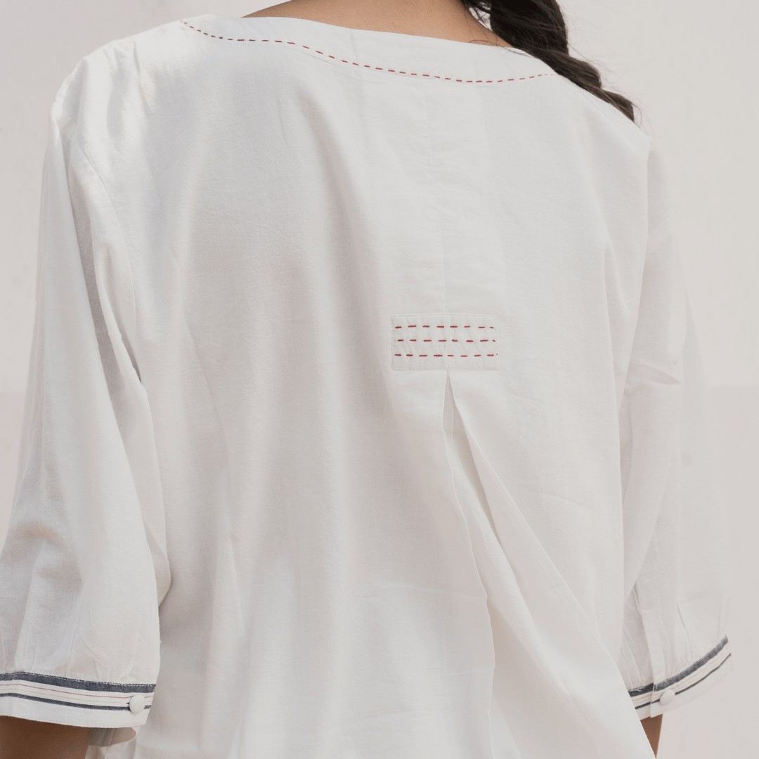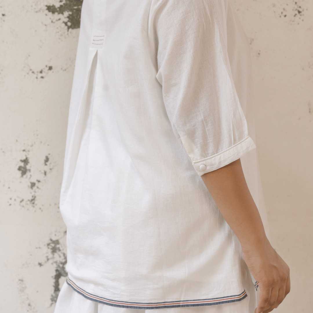 Fully lined, relaxed fitting top with round neckline and front single button opening. Piping & lines of hand stitch detailing, contrast selvedge on hem and sleeve cuffs. Side slits for shaping.