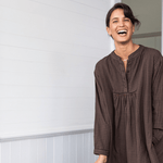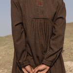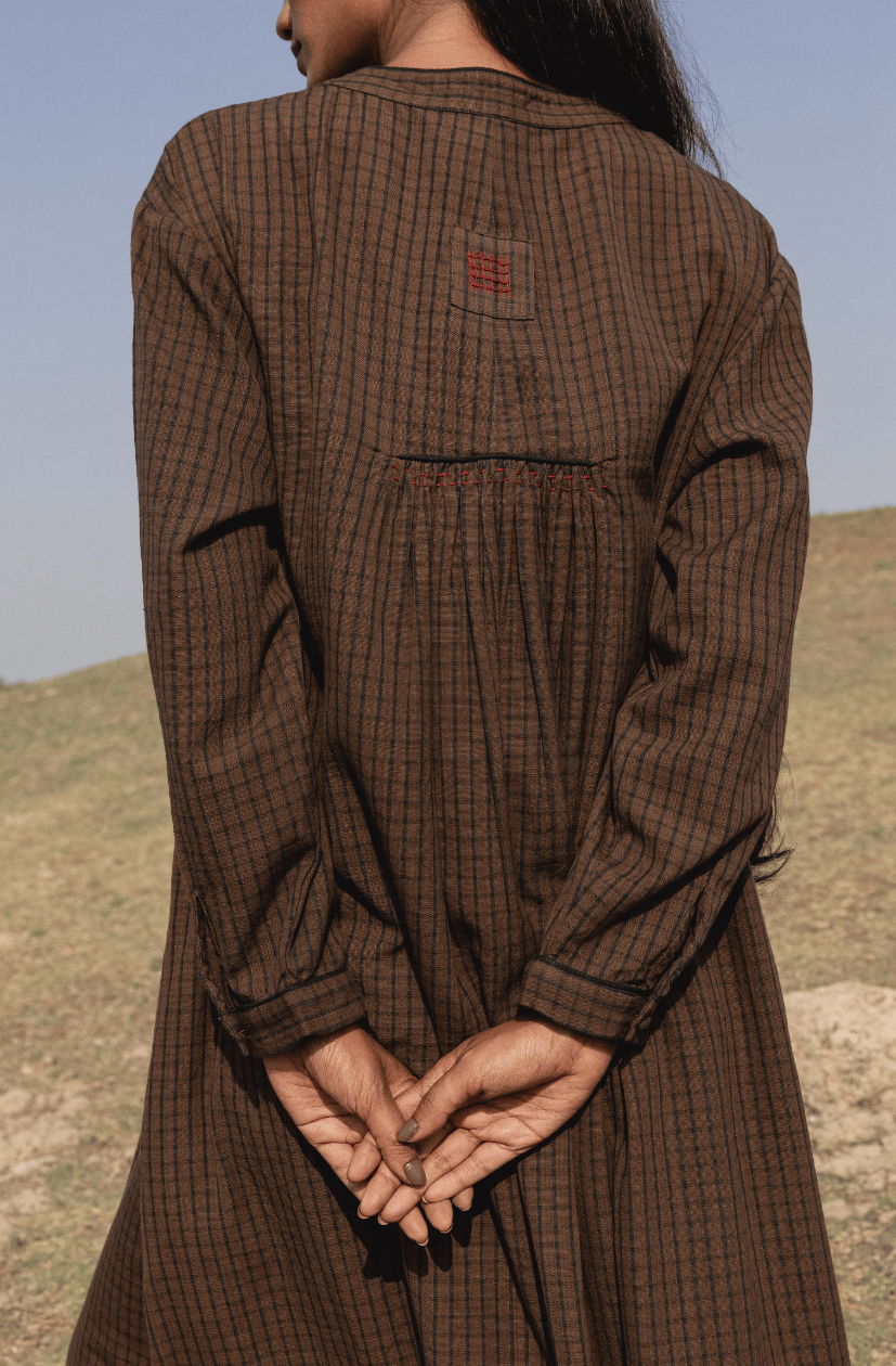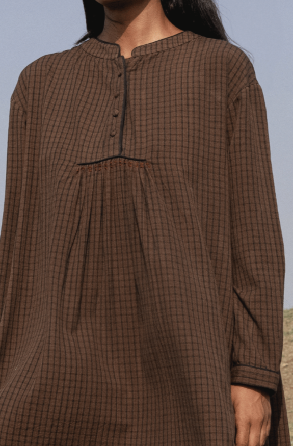 Relaxed fitting comfortable dress with front & back gathers. Round flat collar, beautiful front opening detail finished with fabric buttons. Contrast running stitch detail by hand right through. Inseam pockets.