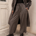 Loose fitting fully lined wide leg pant with side pockets.