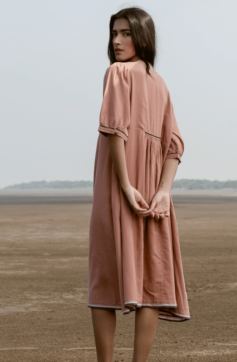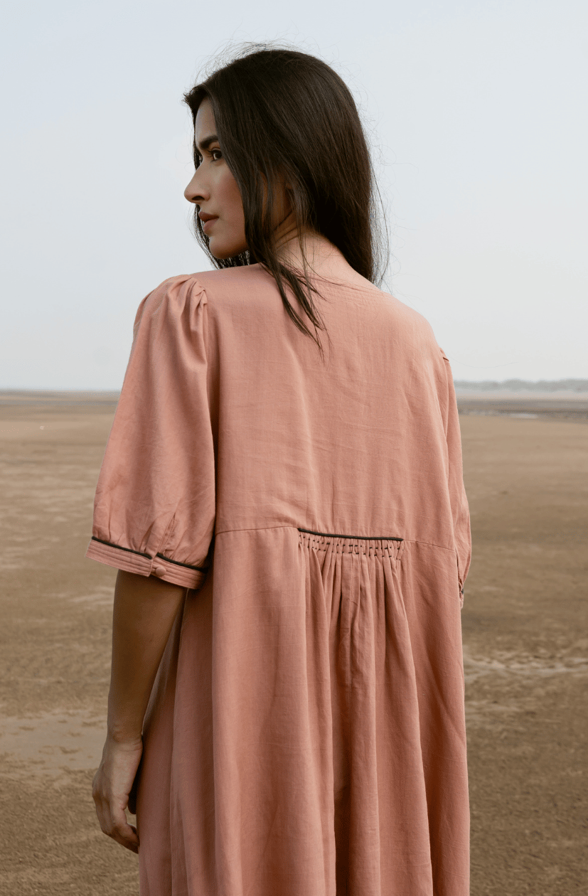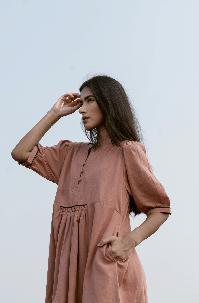 Slightly oversized and free flowing mid length dress fully lined with gathers on front & back. Lines of hand stitch detailing on gathers & front button opening with fabric buttons & loops. Inseam side pockets & mid length full sleeves with cuffs.