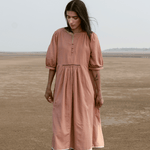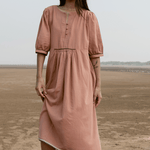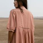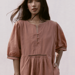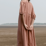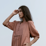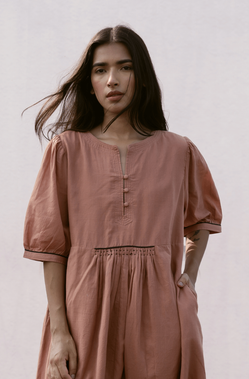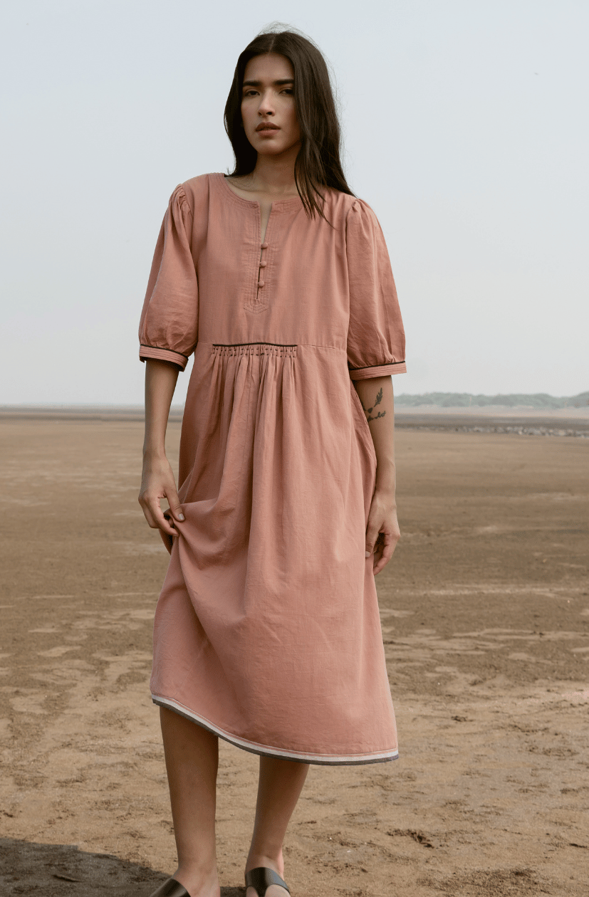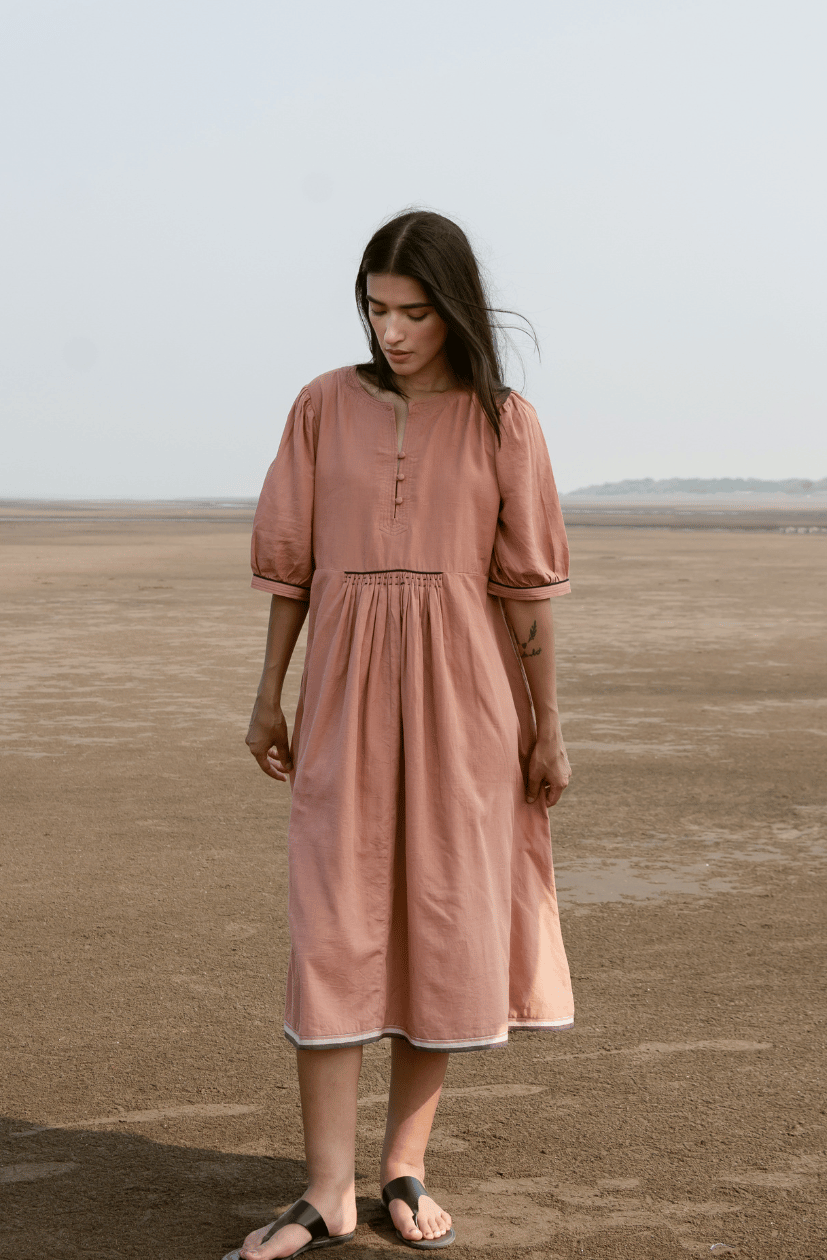 Slightly oversized and free flowing mid length dress fully lined with gathers on front & back. Lines of hand stitch detailing on gathers & front button opening with fabric buttons & loops. Inseam side pockets & mid length full sleeves with cuffs.