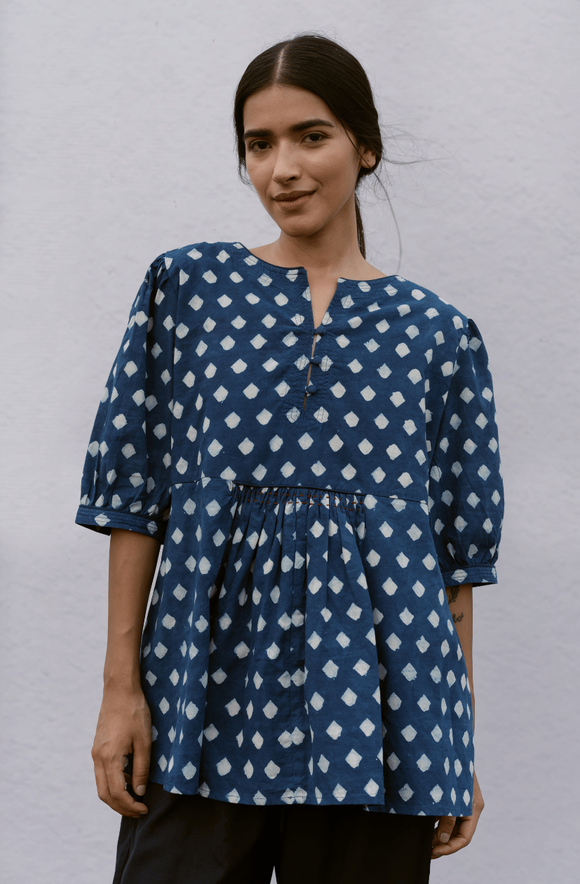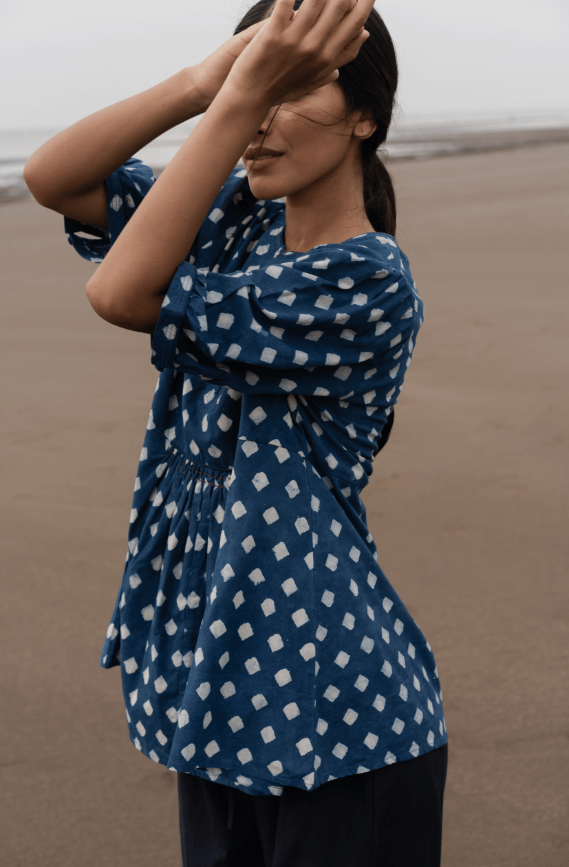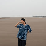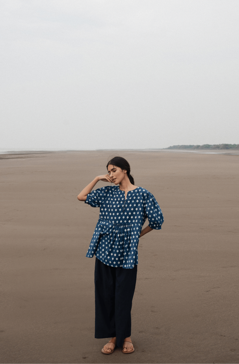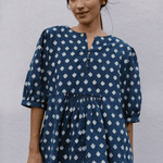 Slowmade process of resist dyeing has created our most beautiful "Indigo Sky" print in cotton. It is a hand dyed print dyed with indigo and needs to be treated with care.