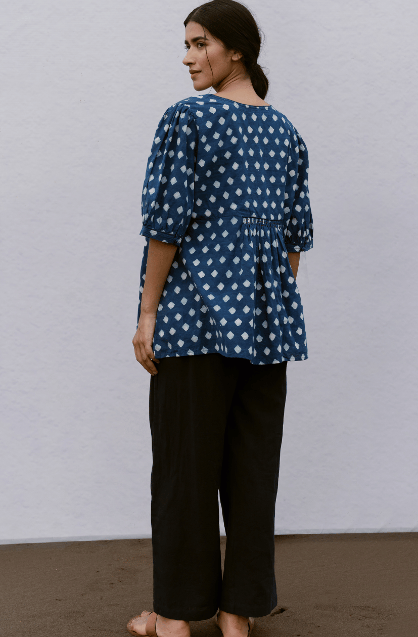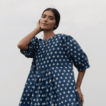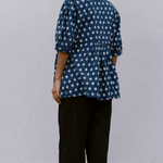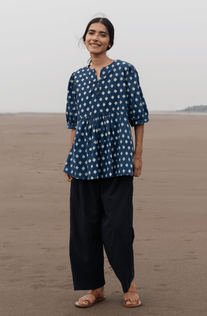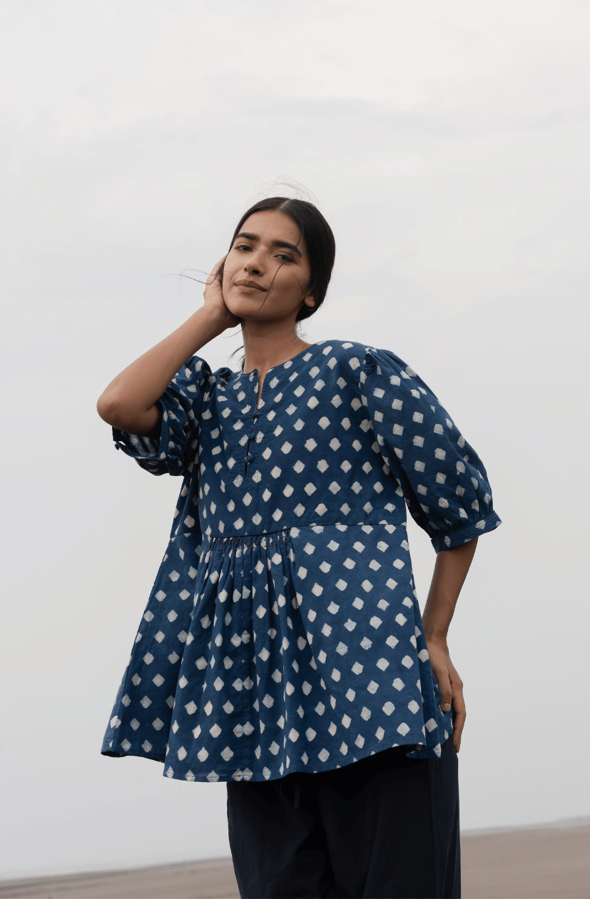 Slowmade process of resist dyeing has created our most beautiful "Indigo Sky" print in cotton. It is a hand dyed print dyed with indigo and needs to be treated with care.