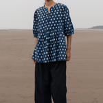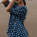 Slow hand made process of resist dyeing printing technique has created our most beautiful "Indigo Sky"  print in breathable 100% cotton.
