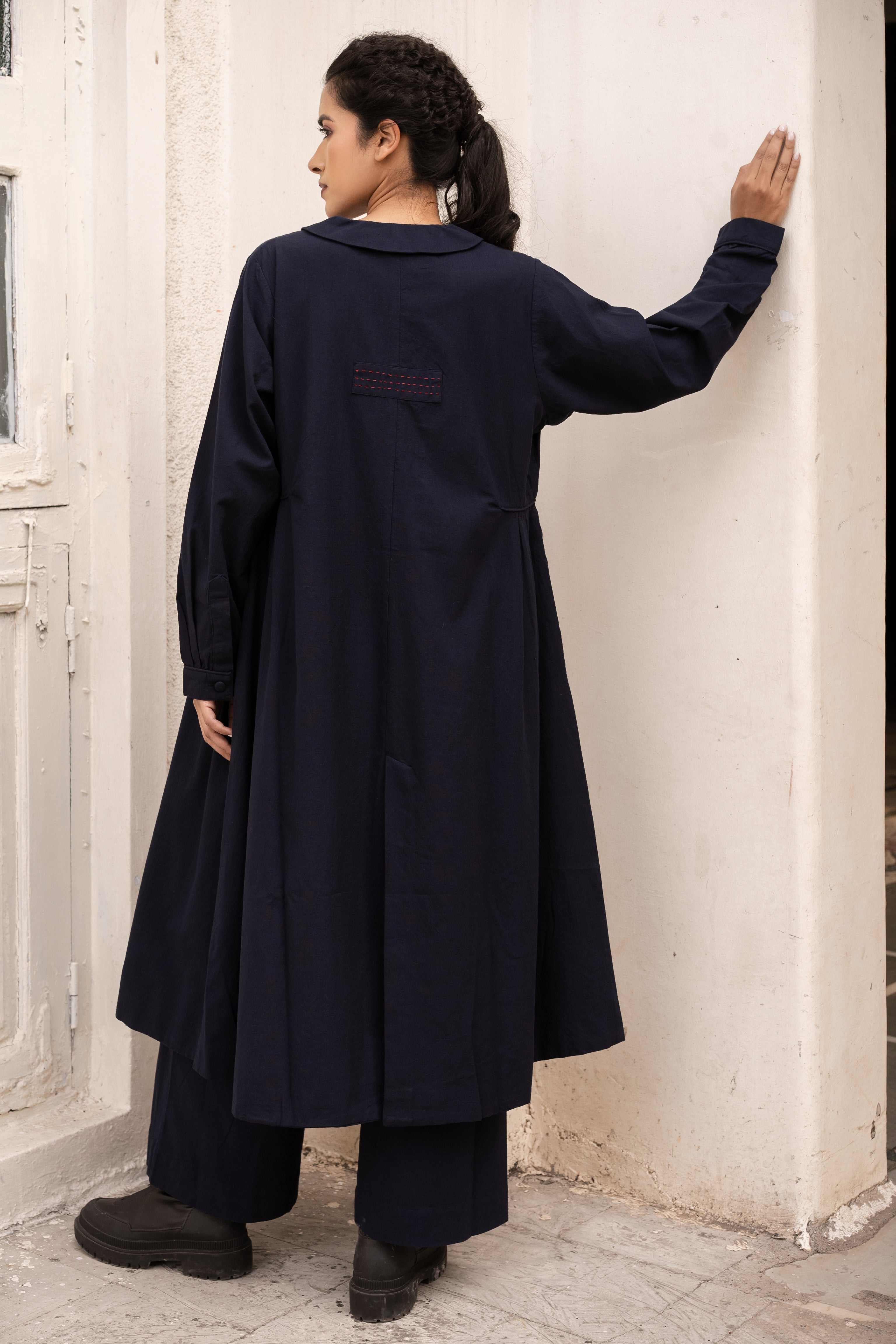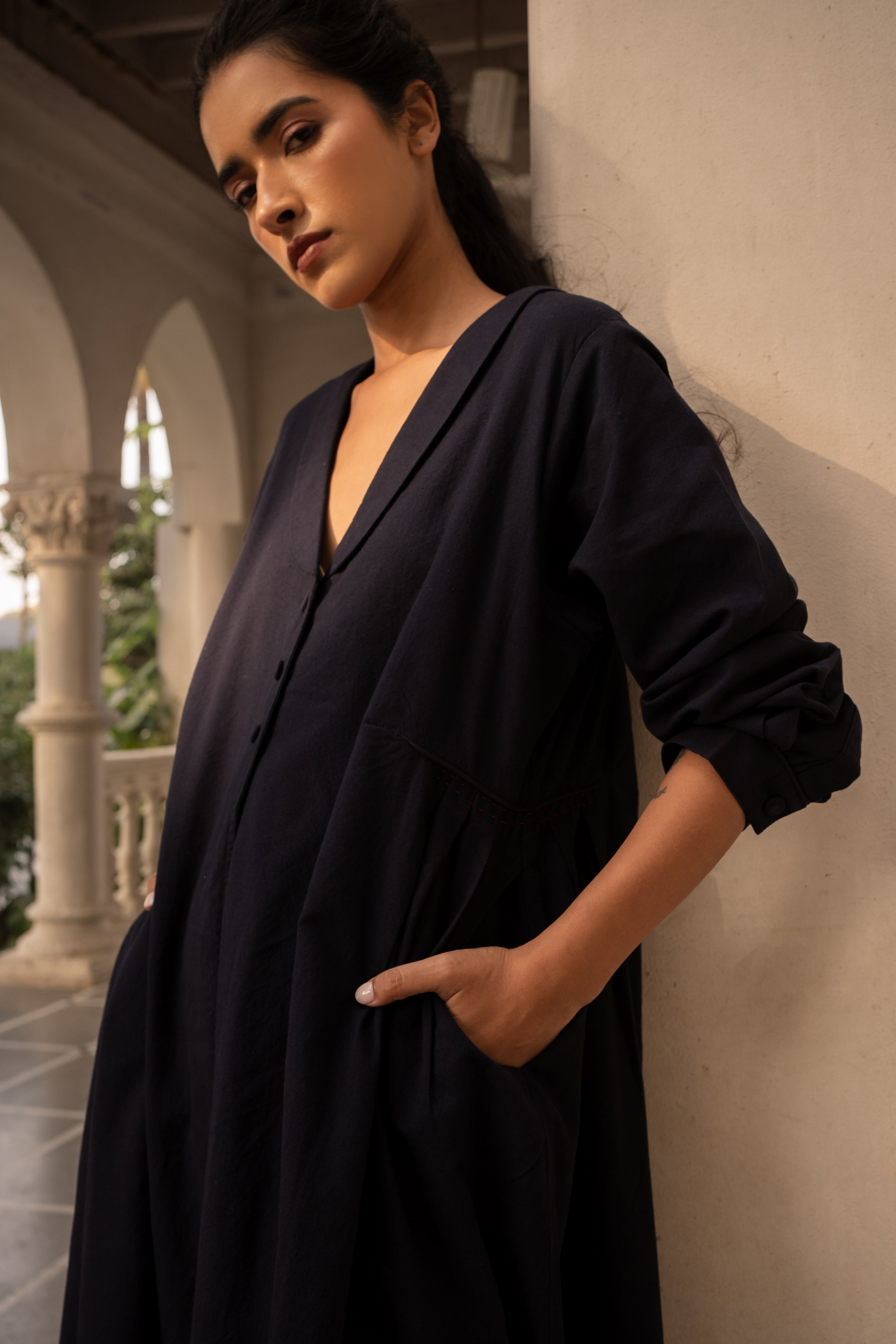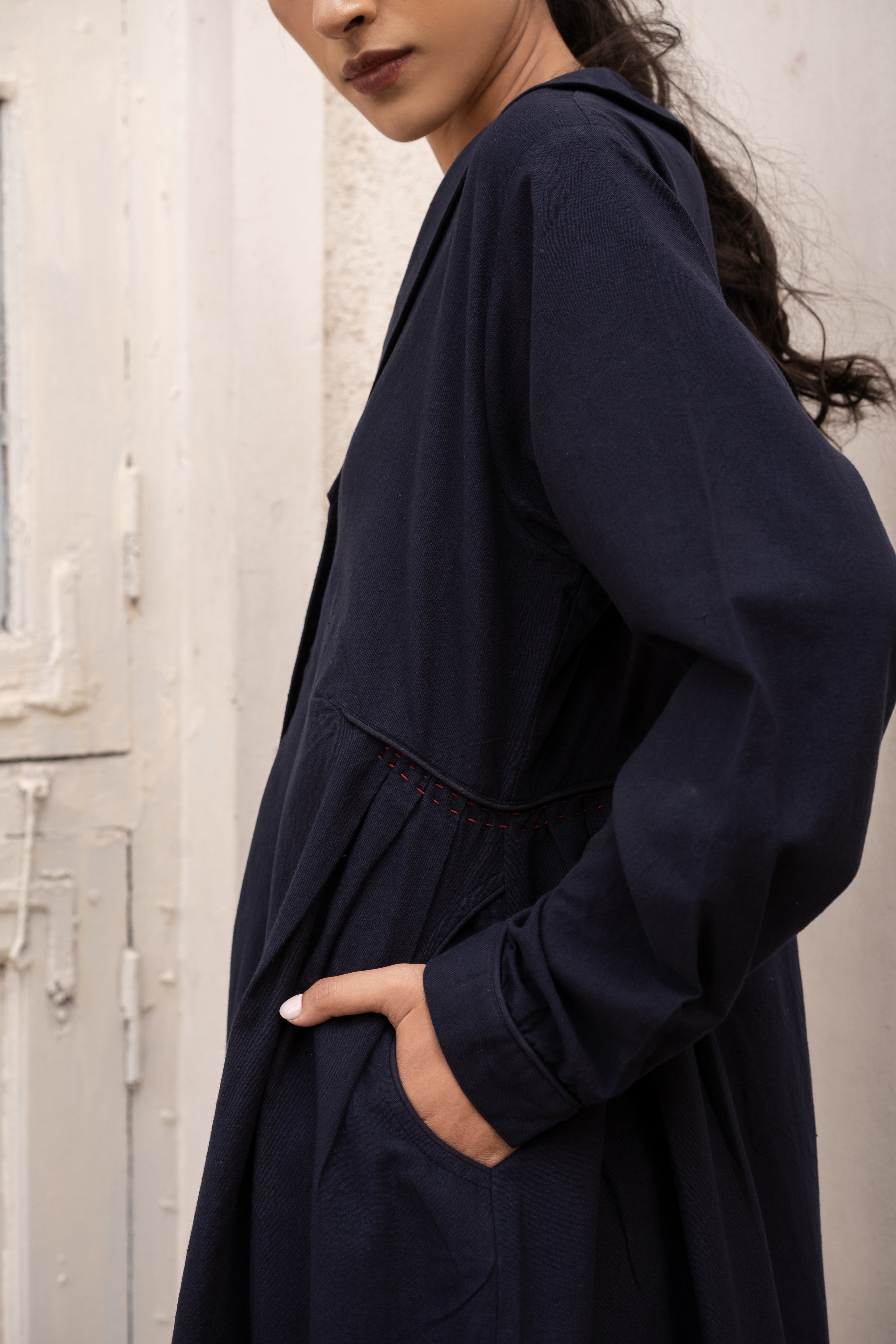 Relaxed fitting, fully lined jacket with flattering collar & side gathers. Slits and side pockets. Enhanced running stitch detailing by hand & self fabric buttons and piping