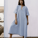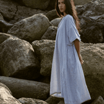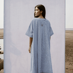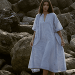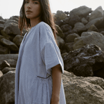 Oversized and mid length relaxed fitting kimono dress. Side gathers with contrast piping and lines of hand stitch detailing on gathers and back inseam side pockets & fully lined. Contrast selvage hem detailing on hem.