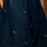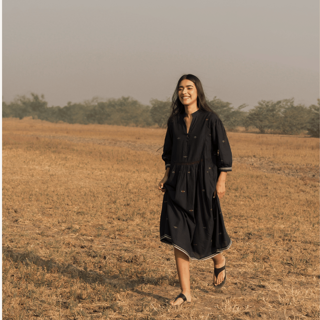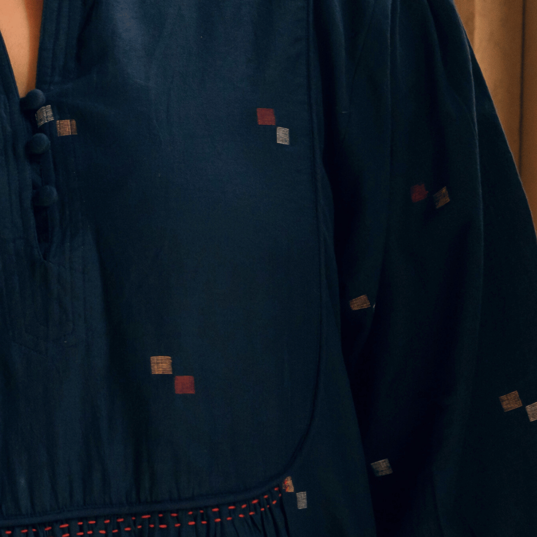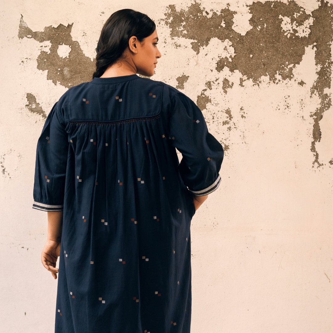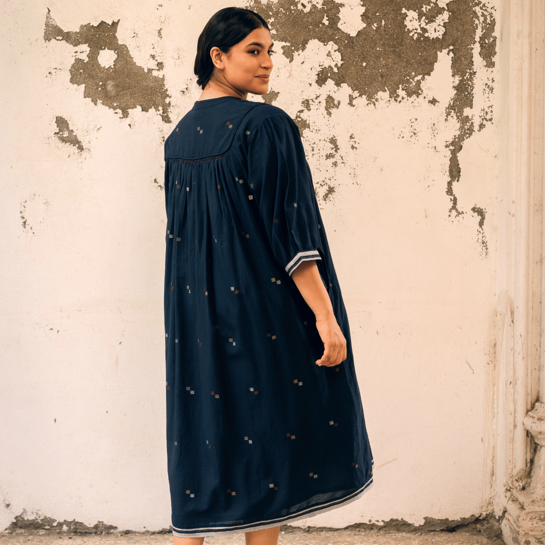 A free-flowing, fully lined dress with stitched yoke and collar, mid-length sleeves with buttoned cuffs, and side pockets with piped edges. Four-button front opening with subtle red stitching, and contrast hand-stitch detailing over the gathers for a delicate artisanal touch.