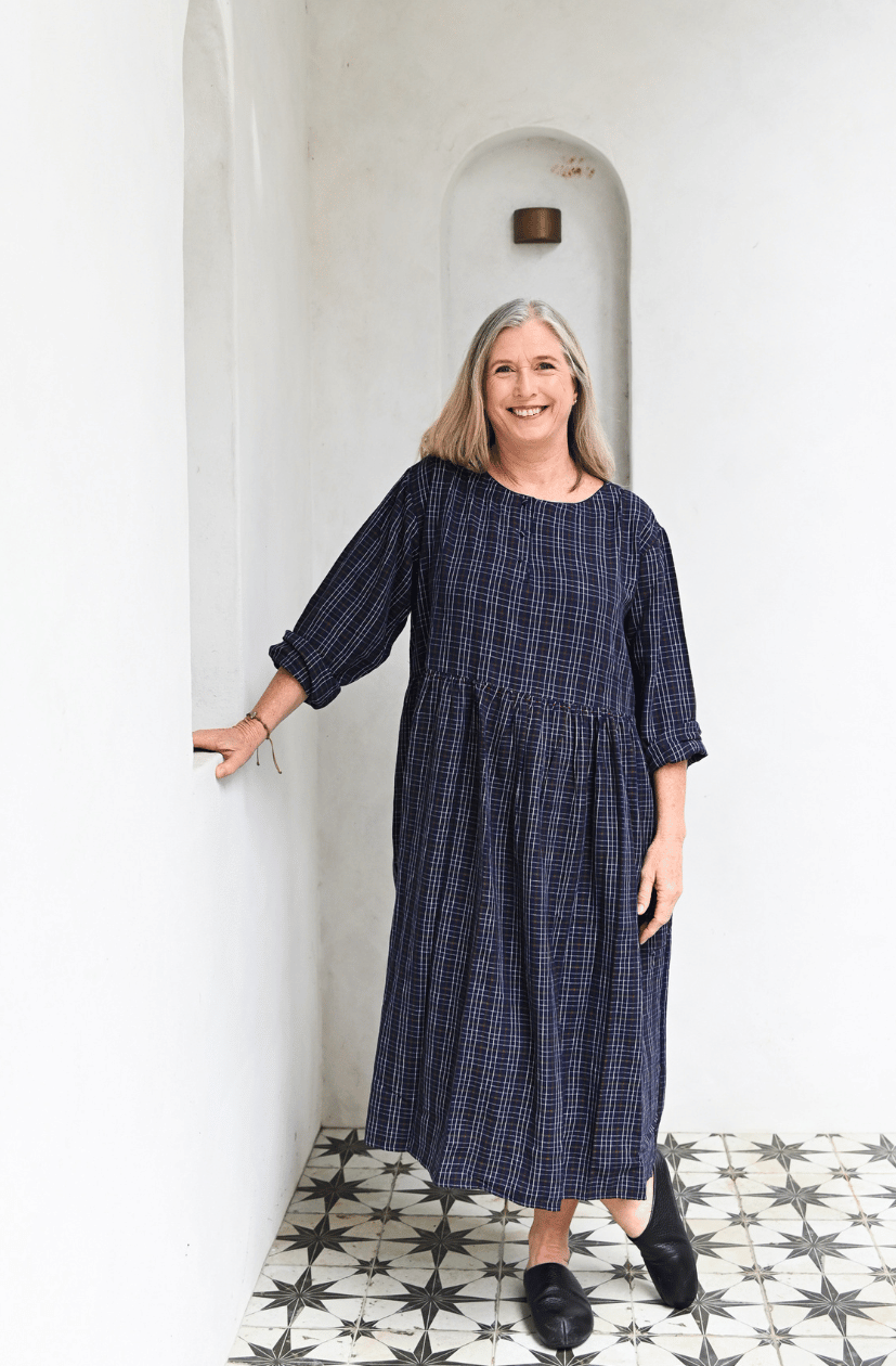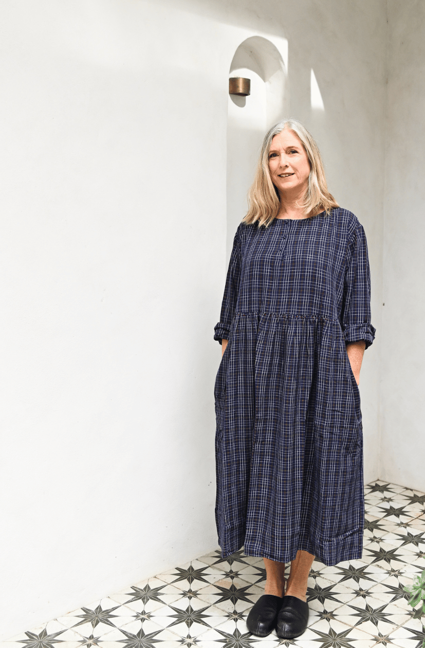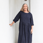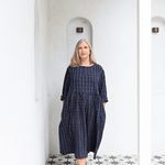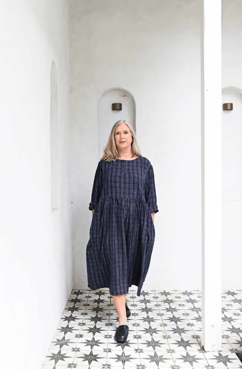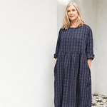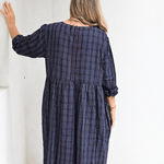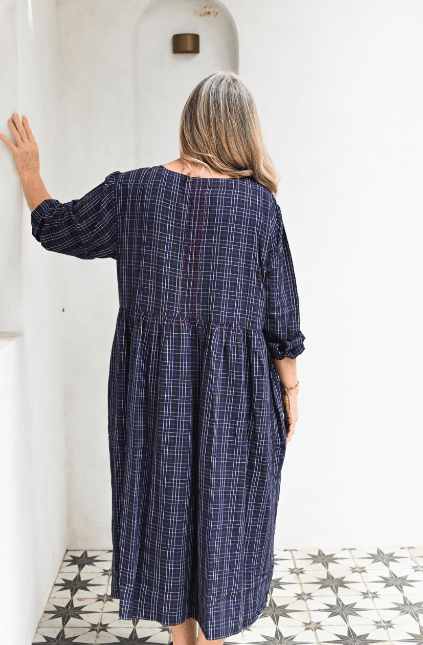 Mid waisted, relaxed dress with long sleeves. Round neckline with front opening and fabric buttons. Back pintucks finished with contrast running stitch detail by hand. Inseam pockets.