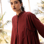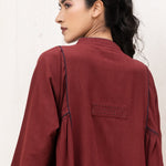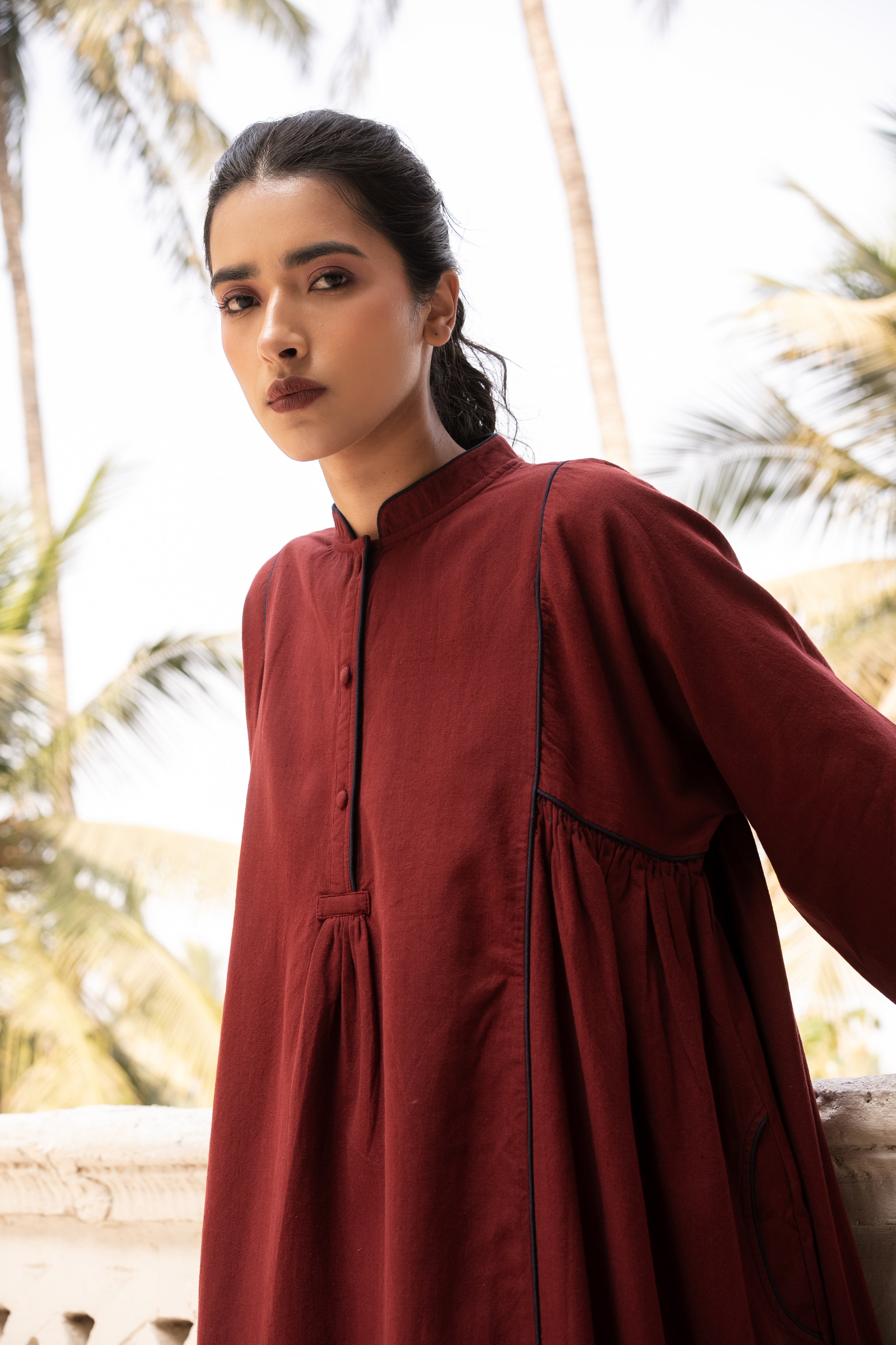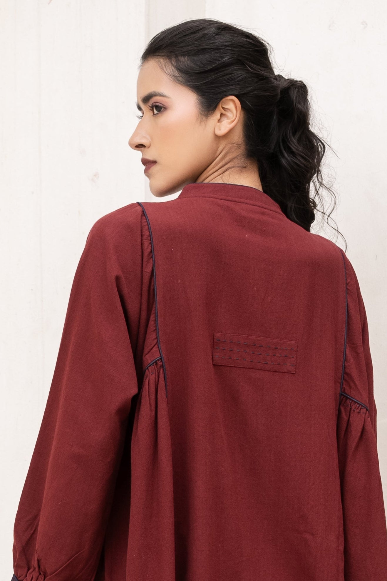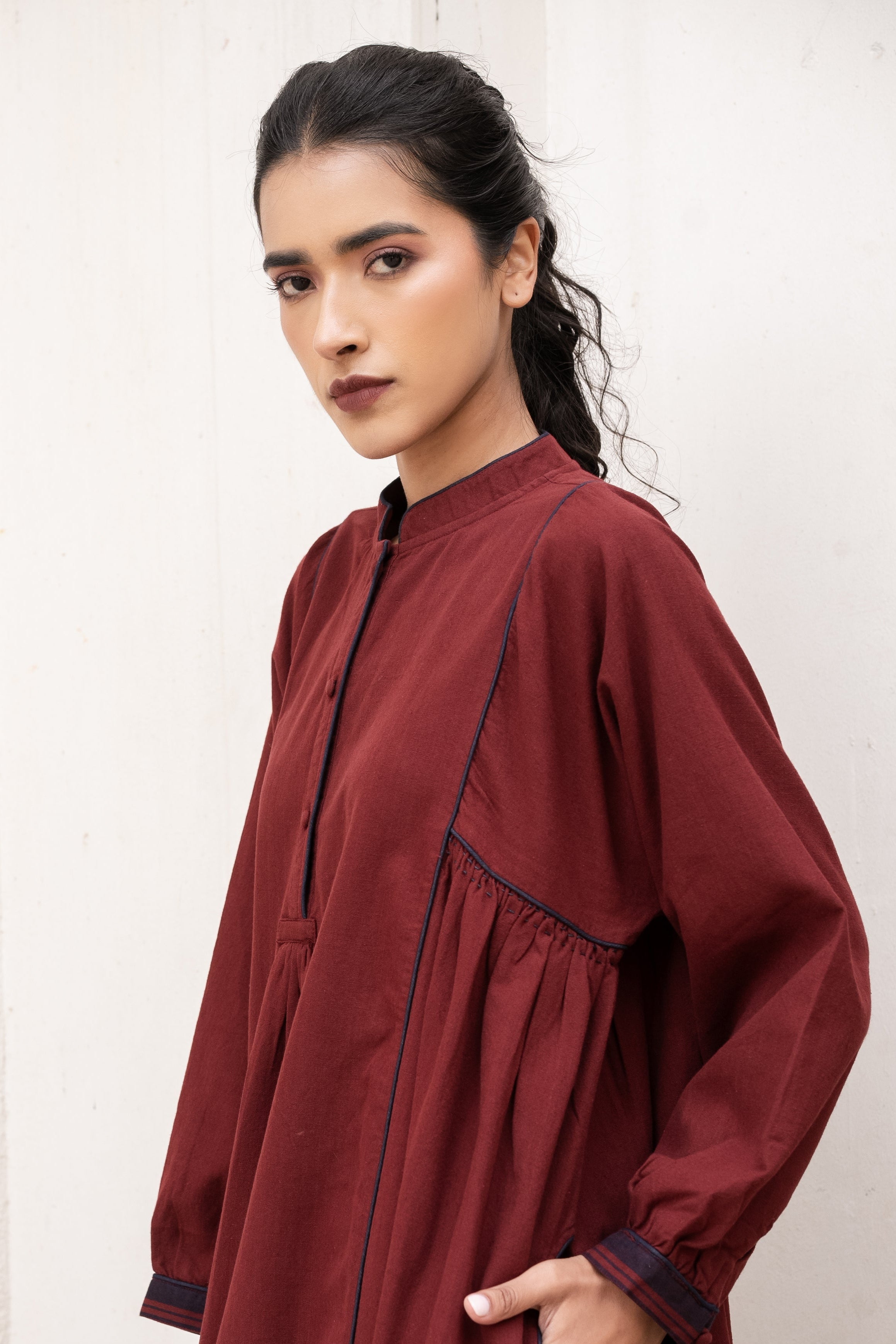 Free flowing top with side gathers, stand collar, front opening &  placket with soft front gathers. Long length sleeves with cuffs & single button finish.  Fully lined, contrast piping and running hand stitch detail.