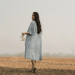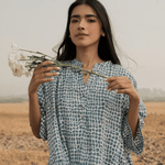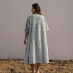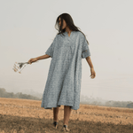 An oversized, mid-length kimono dress featuring a soft V-neckline and front opening with self-covered buttons. Thoughtfully detailed with gentle side gathers, delicate hand-stitched lines, and subtle piping for texture and shape. Designed with inseam side pockets and fully lined for comfort and ease.
